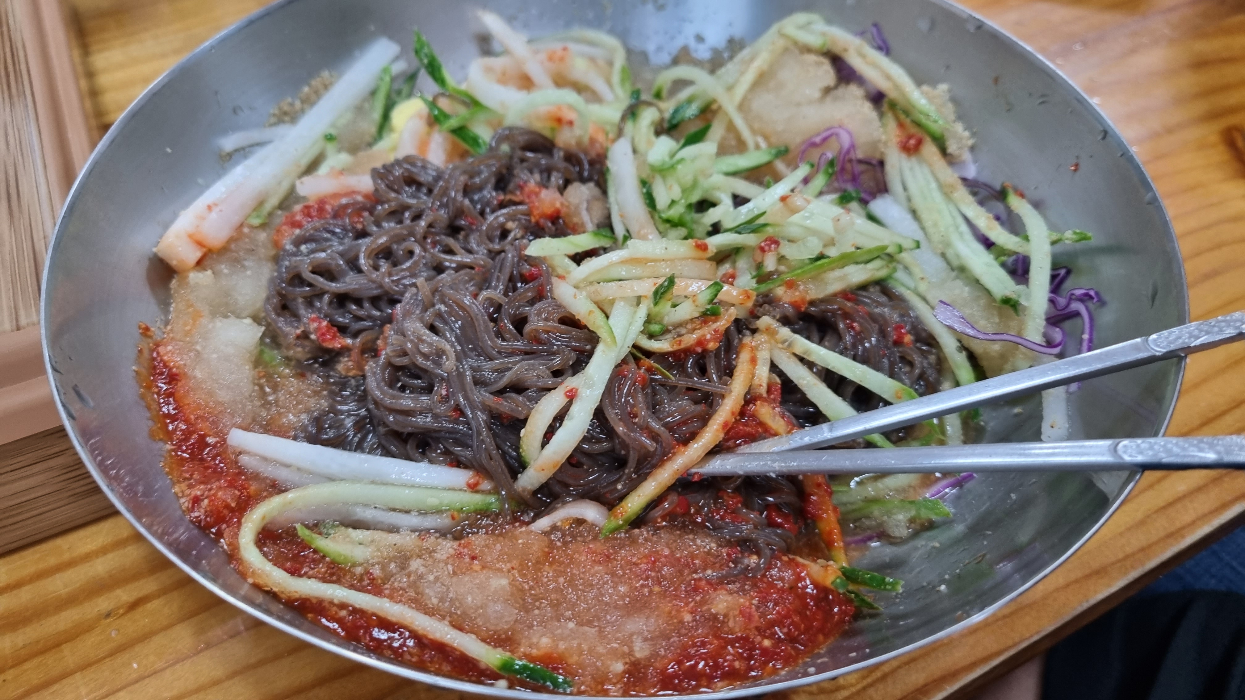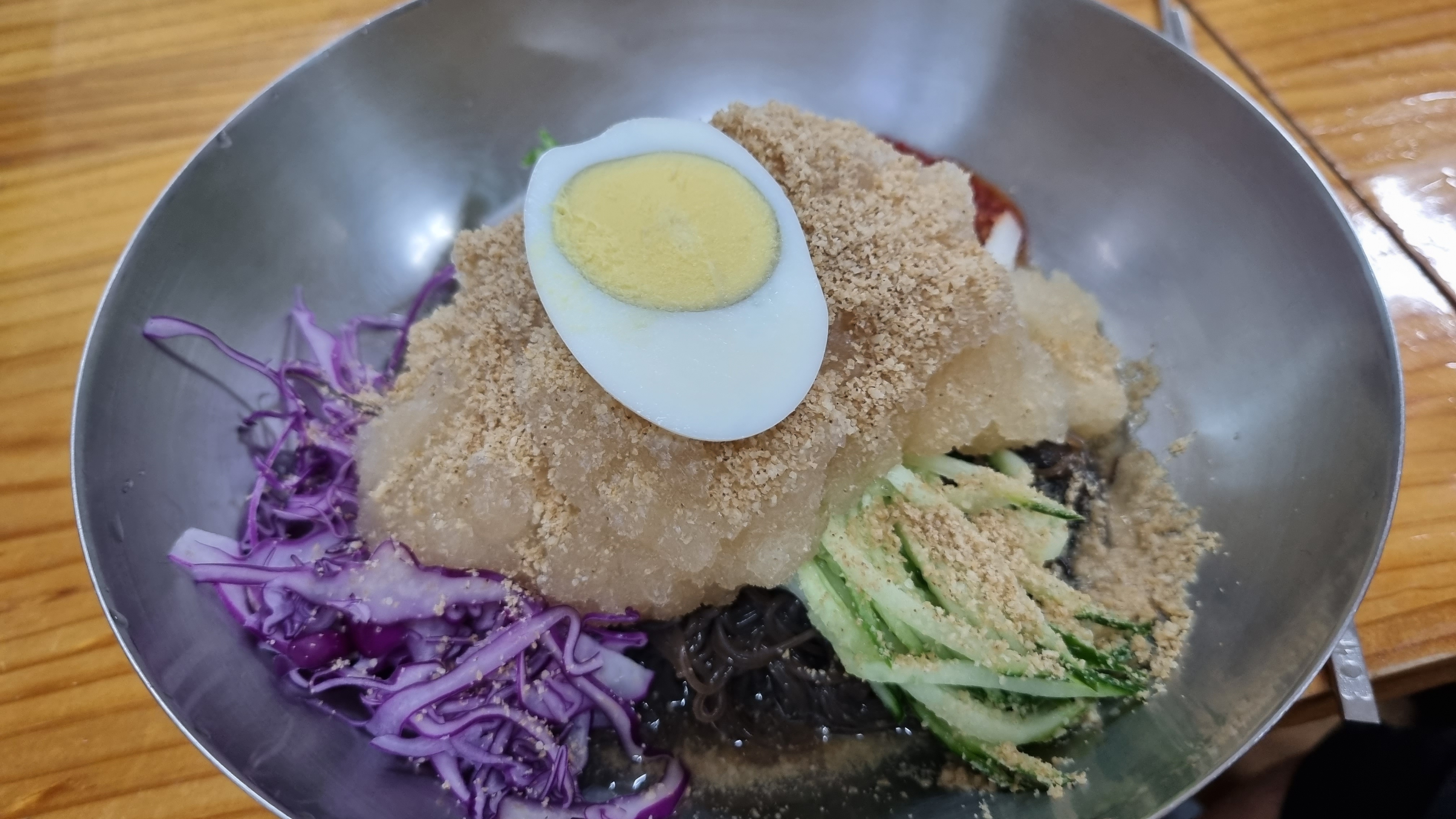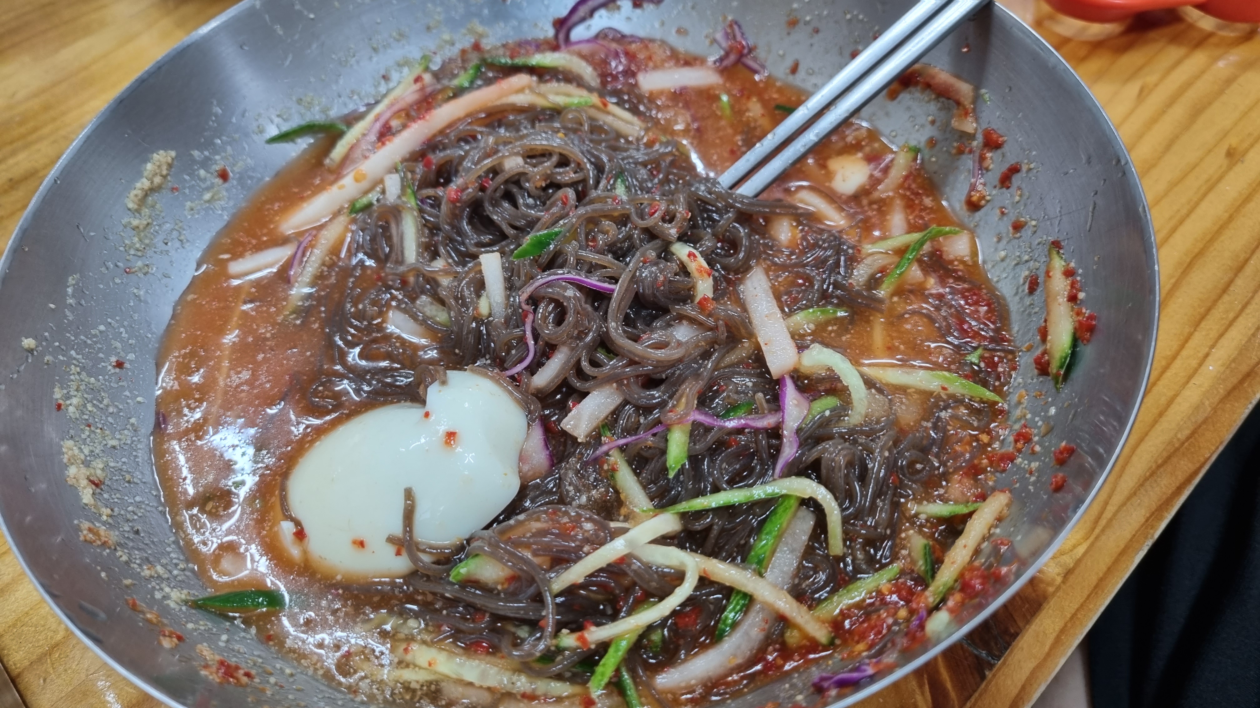 이곳이 그 유명한 관산식당 칡냉면입니다. 별도로 물냉 비냉이 없으며 비비면서 살얼음이 녹으면 시원한 국물이 정말 맛있습니다.