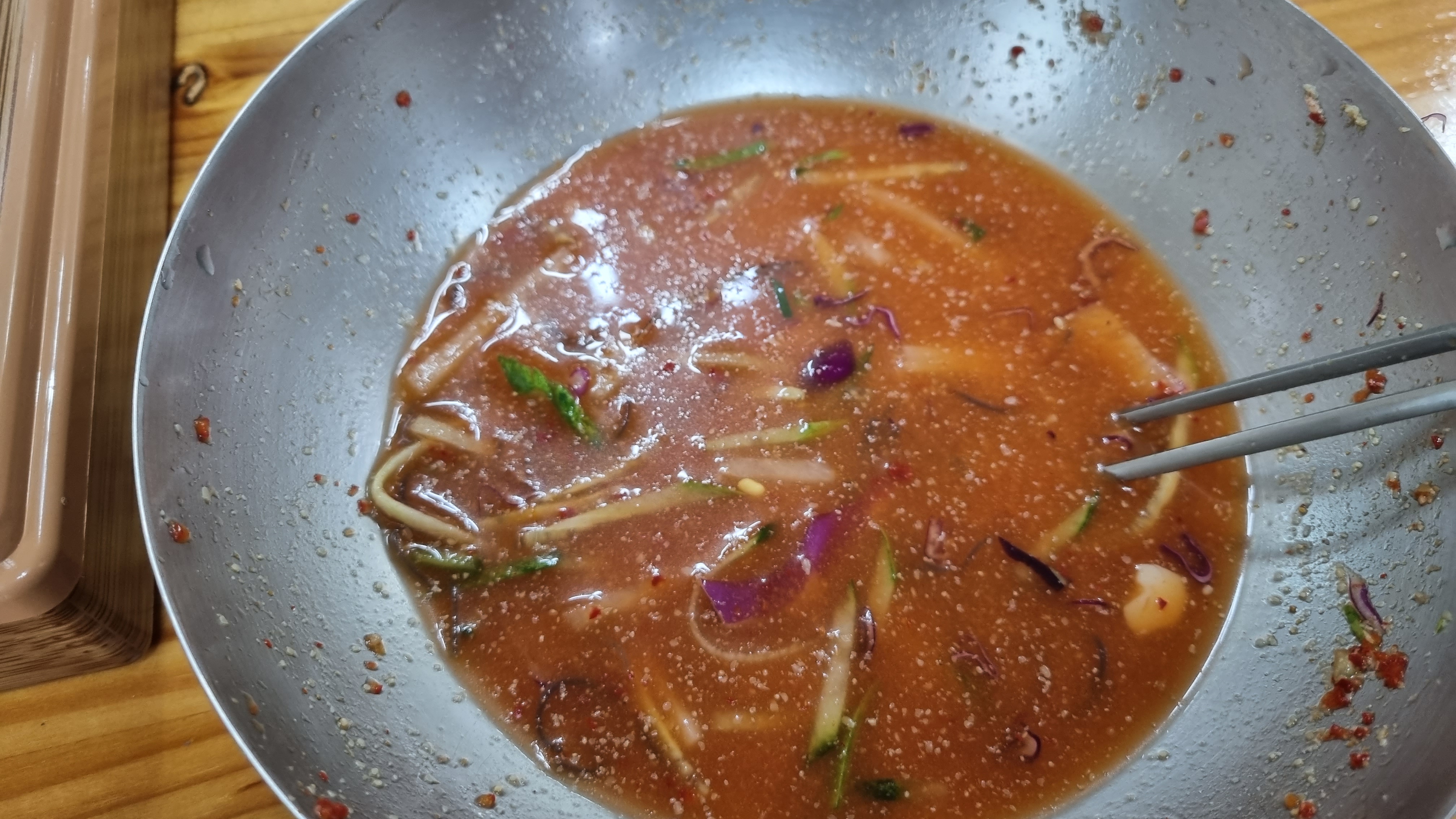 여기서 저기 빨간 양념장을 빼주면 물냉면이라고 하는데 특별한 의미는 없을 듯합니다. 양념장을 넣은 것이 훨씬 더 맛있습니다.