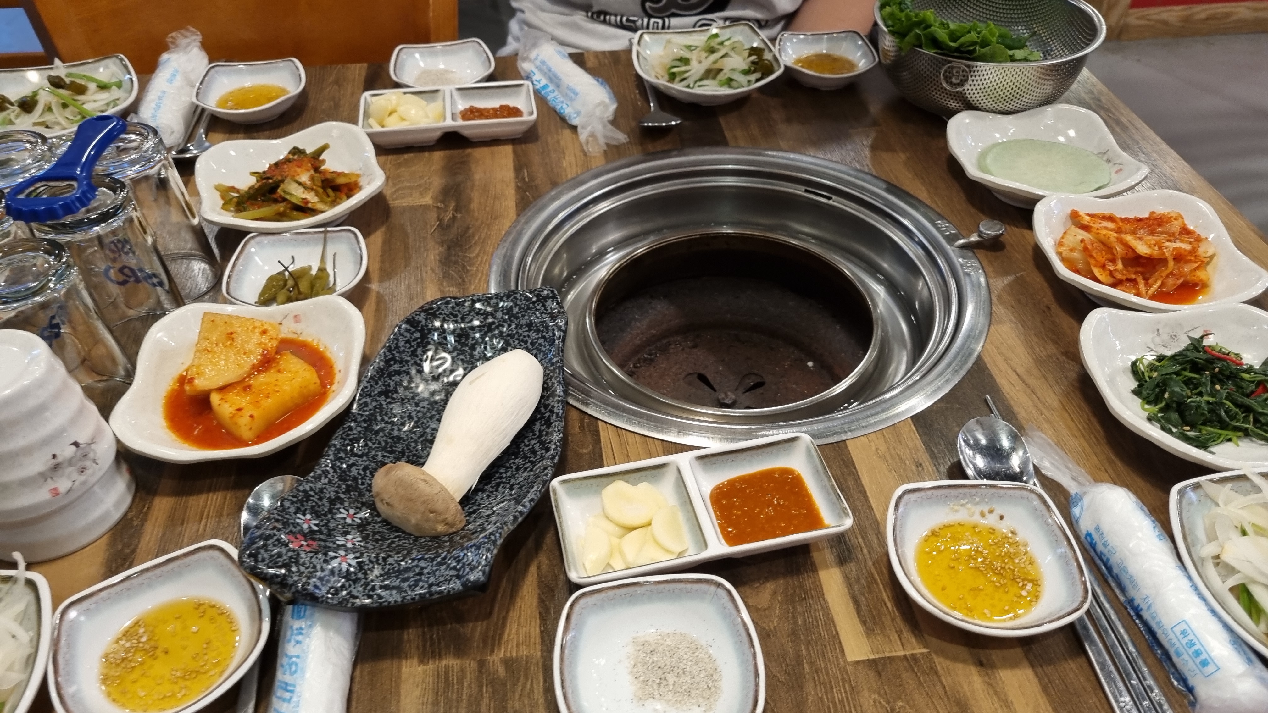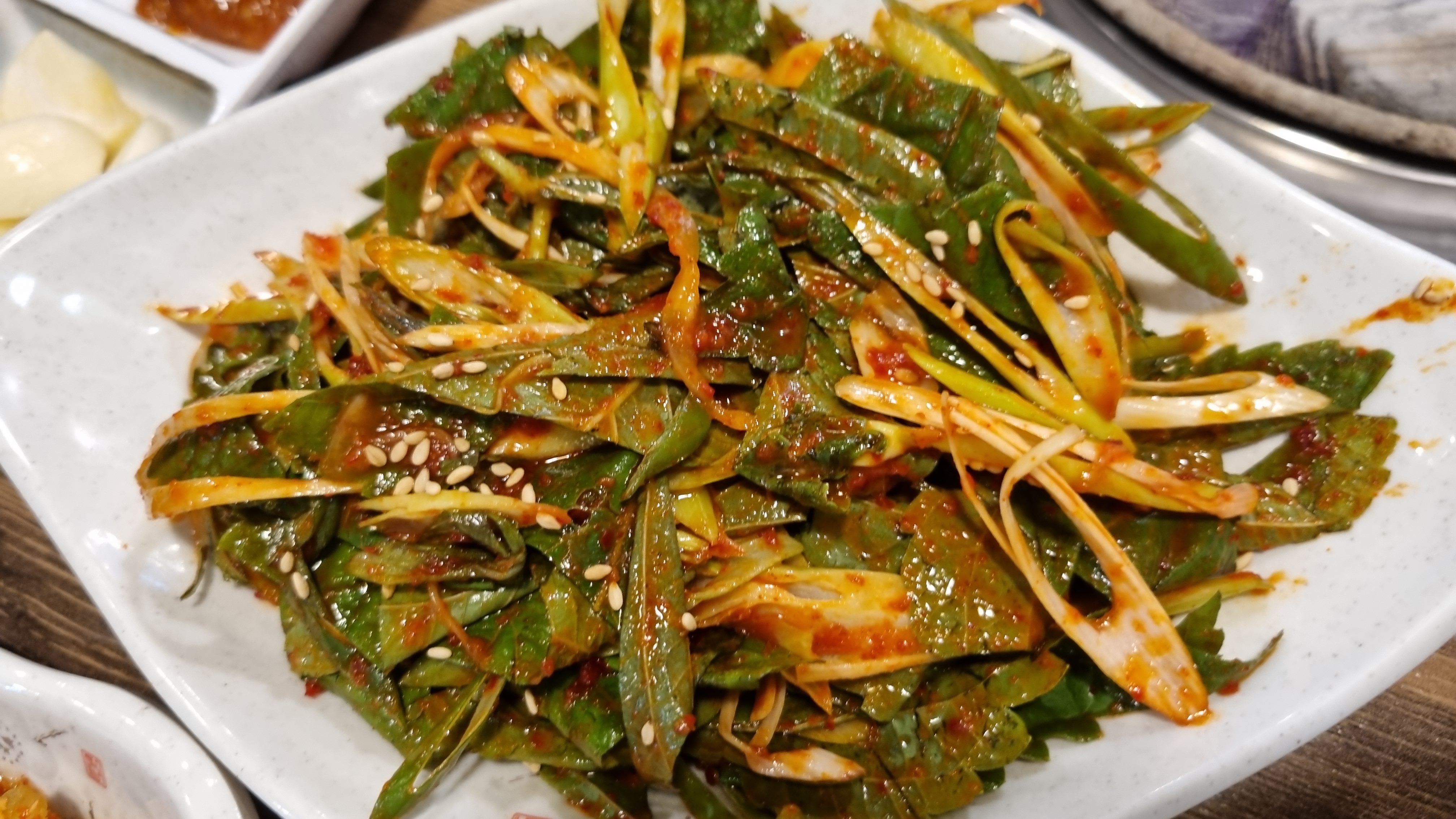 이곳에서 특히 인상이 깊은 것은 쌈인데 보통 상추에 파무침나 양파 등을 넣어 쌈으로 먹는데 위의 사진처럼 파와 깻잎등의 채소를 혼합하여 양념한 것이 매우 맛있었습니다.