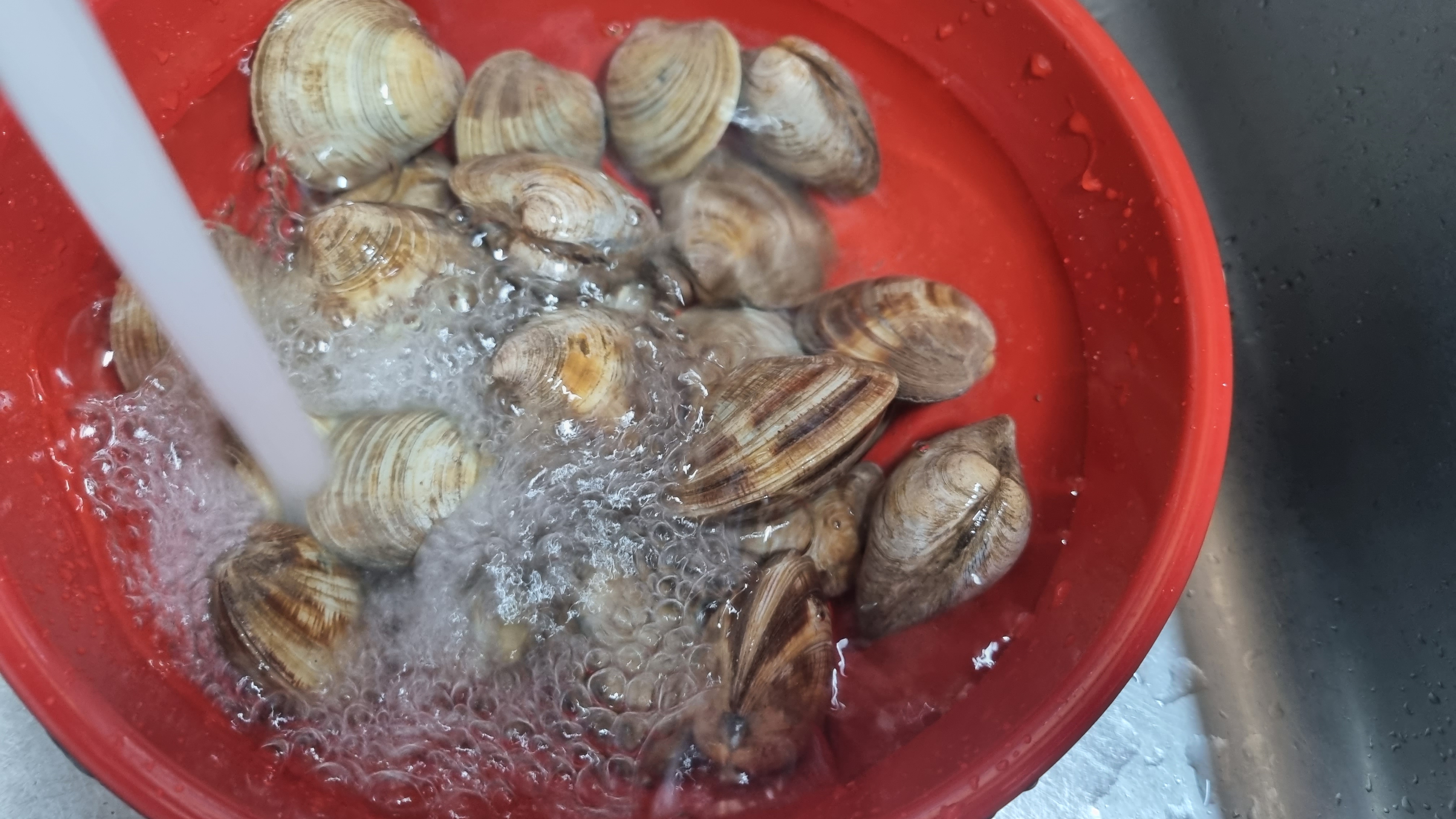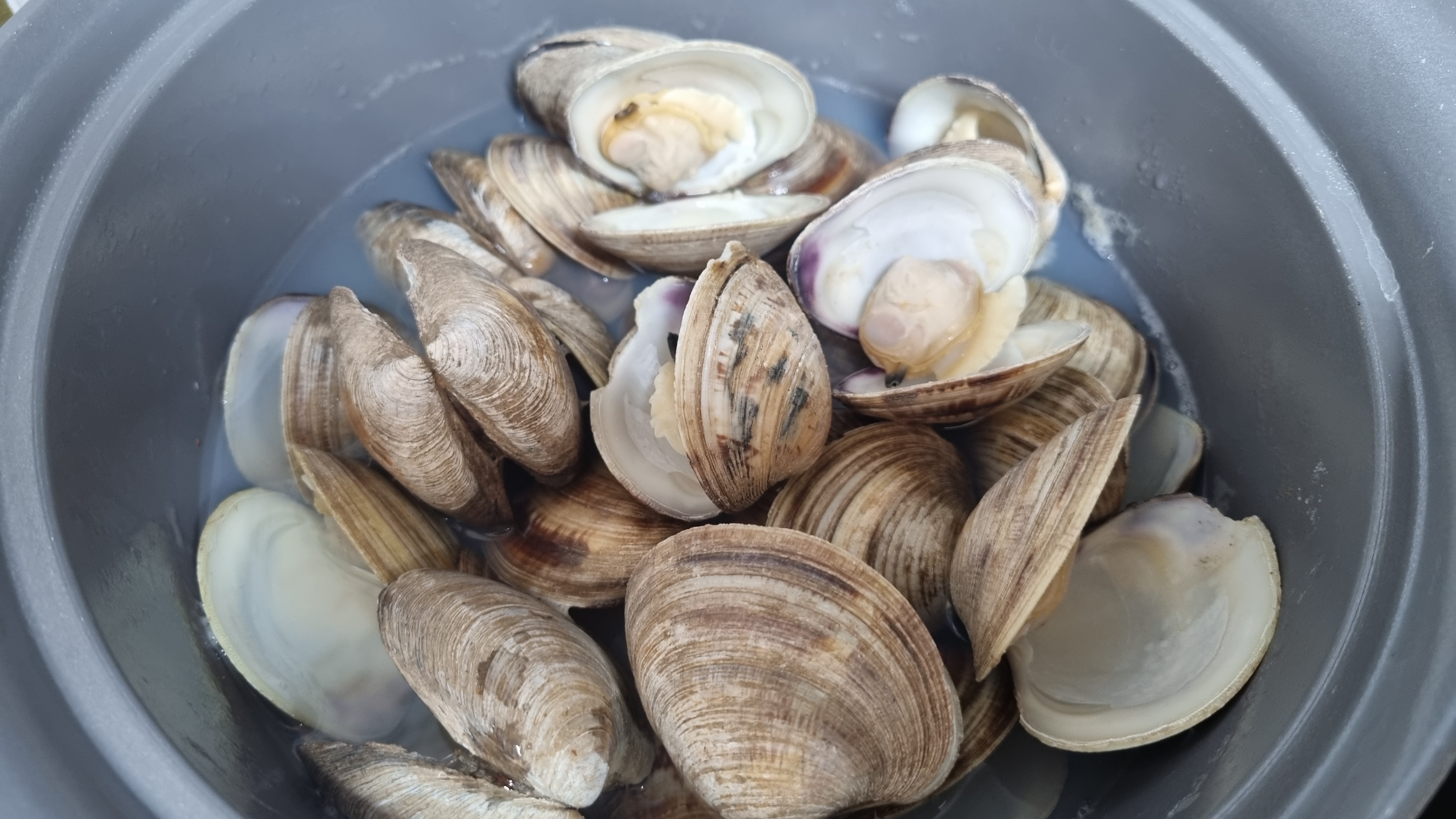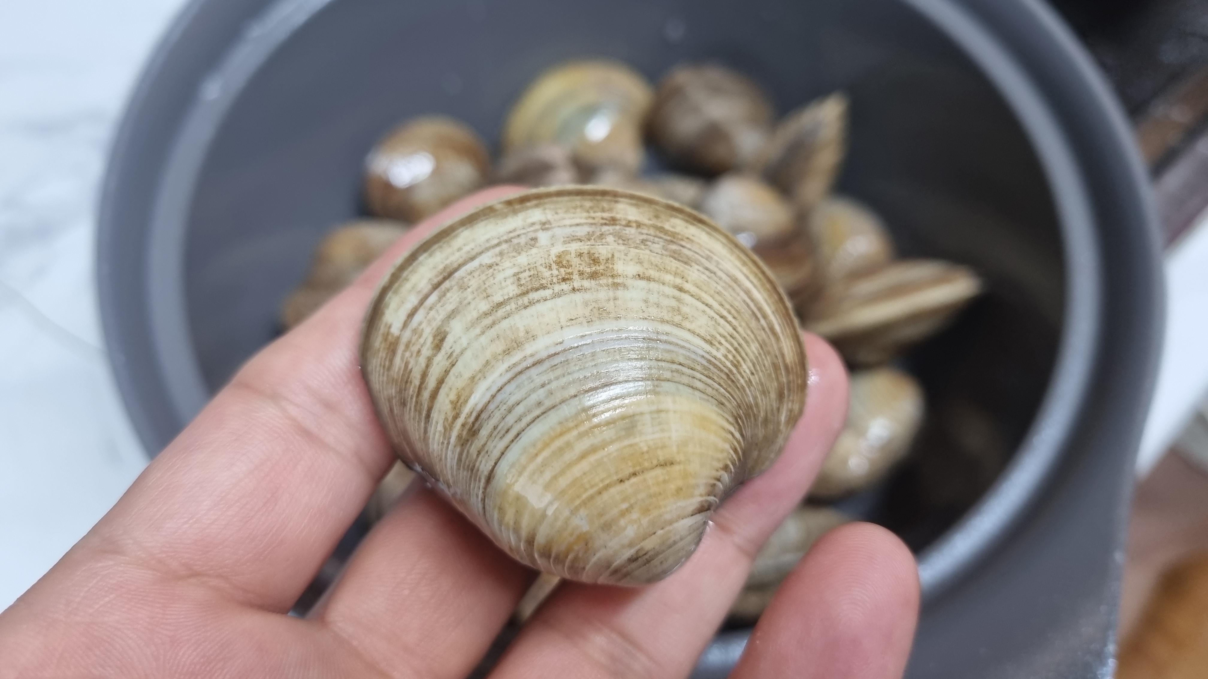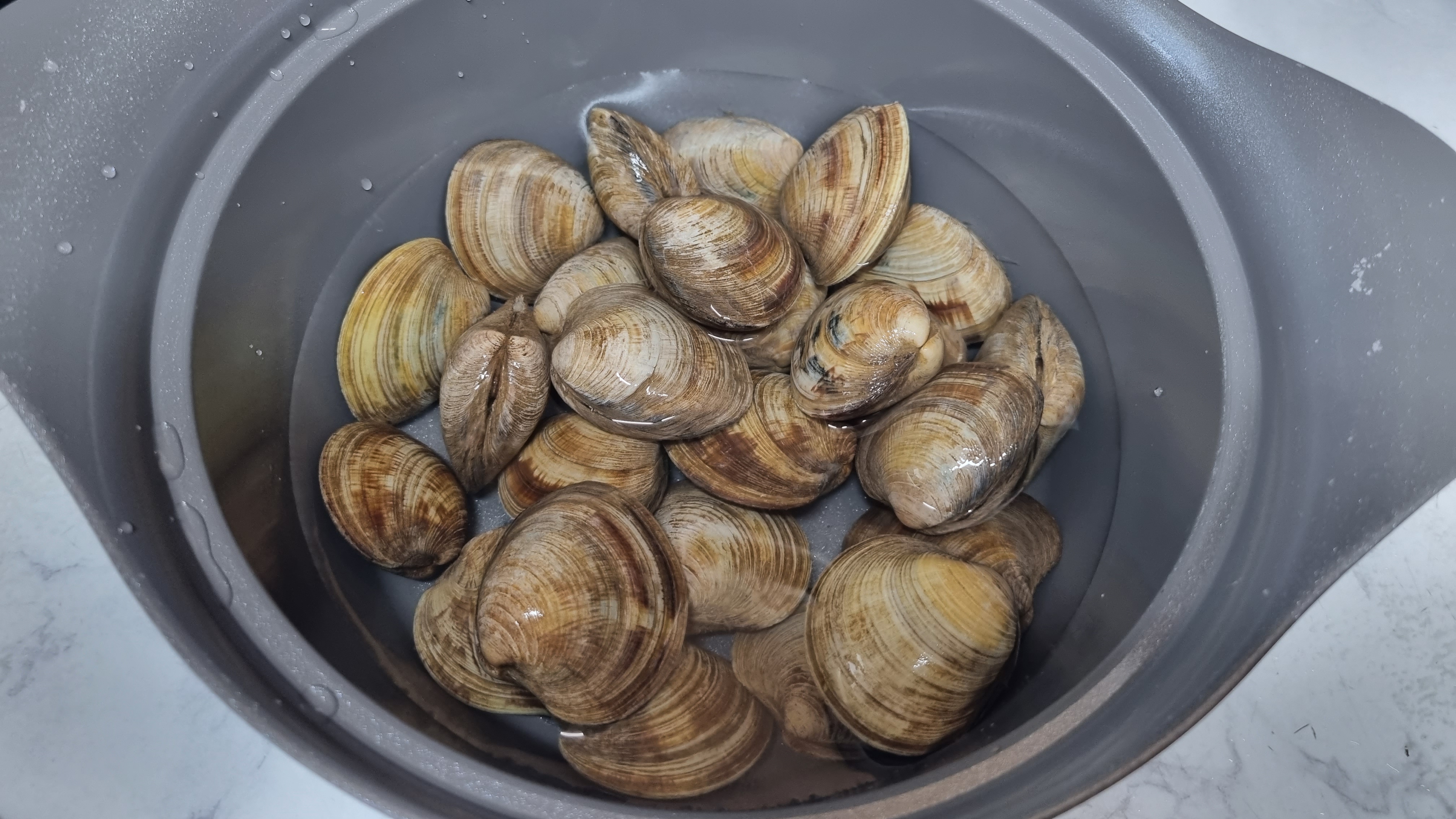 깨끗이 씻고 해감까지 끝마친 상태입니다. 만약 조개 표면이 깨끗하지 못하면 솔을 이용하여 문질러 이물질 등을 제거하면 됩니다.