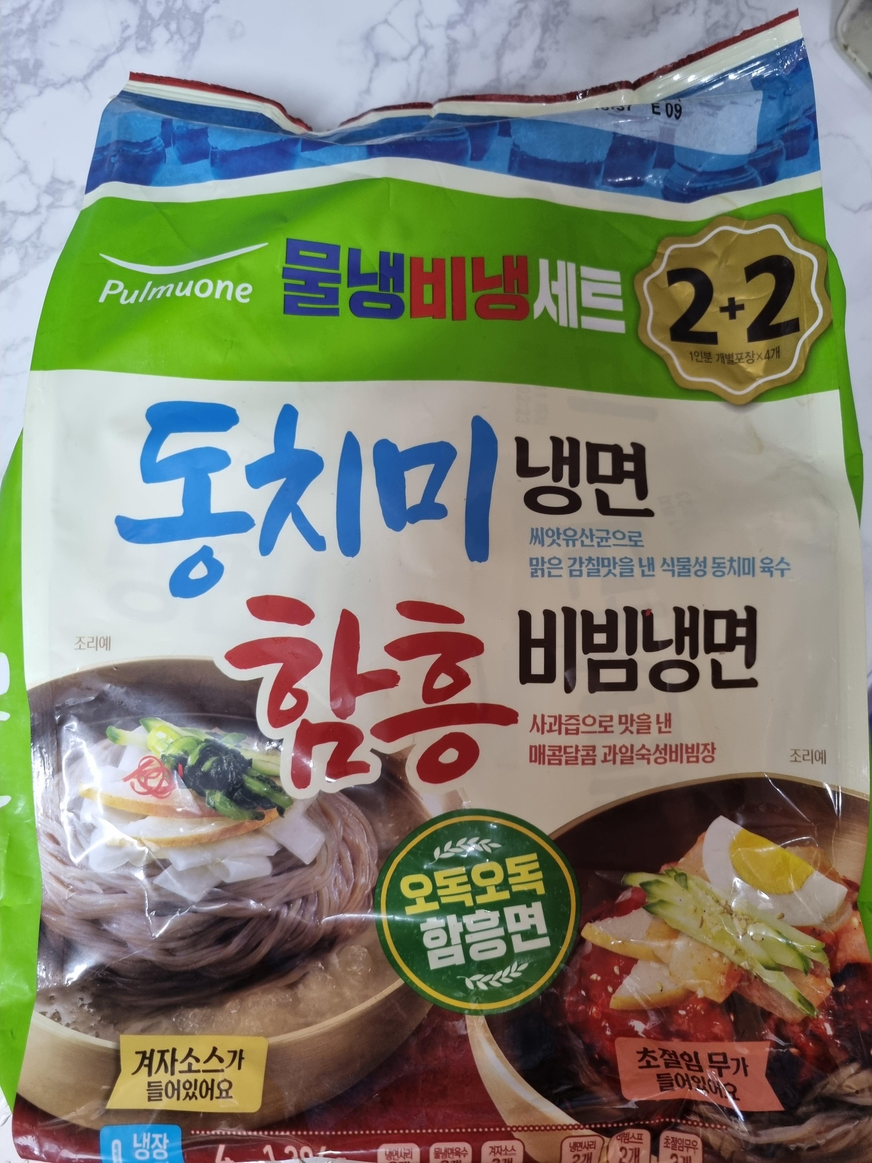이렇게 한봉지에 세트로 들어있는 제품입니다 풀무원에서 나오는건데 동치미냉면 2인분과 함흥 비빔냉면이 2인분이 들어 있는 4인분인데 이것으로 아래와 같이 맛있게 만들어 먹어 보겠습니다.