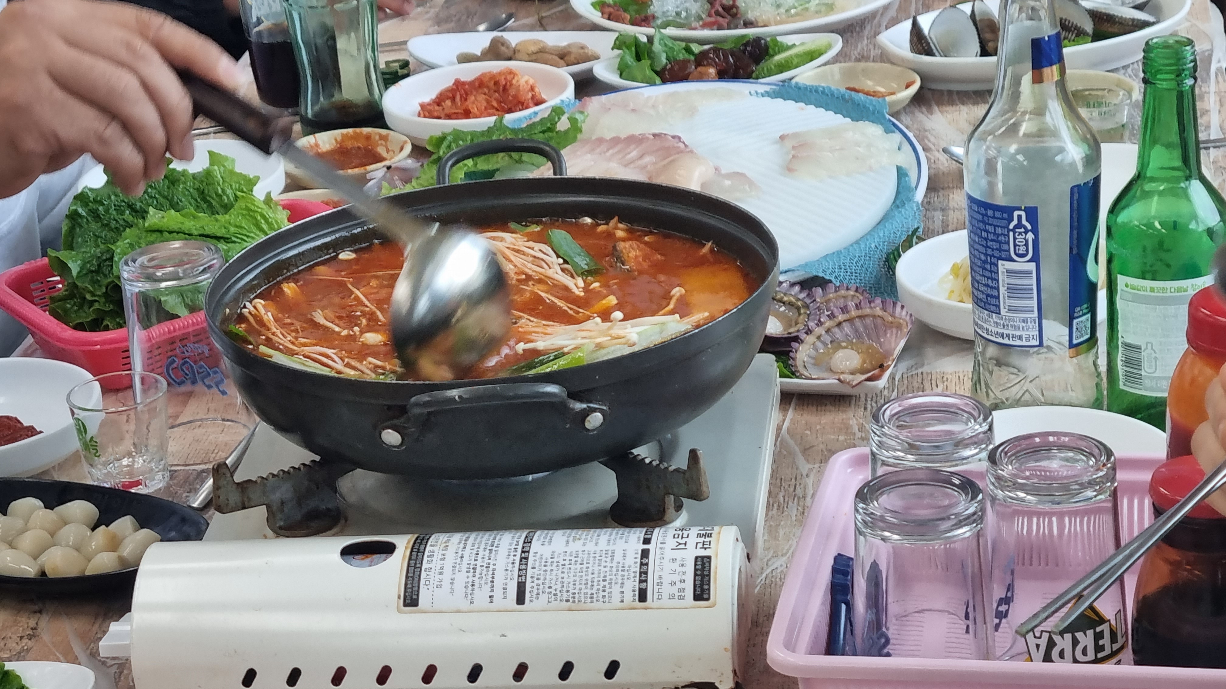 매운탕은 기본적으로 끓여서 나오지만 테이블에서 더 푹 끓여야 더 진한 국물이 나오게 됩니다. 나오는 것 조금 끓여서 바로 드시면 국물이 싱겁거나 진한 맛을 느낄 수 없을 수도 있습니다.