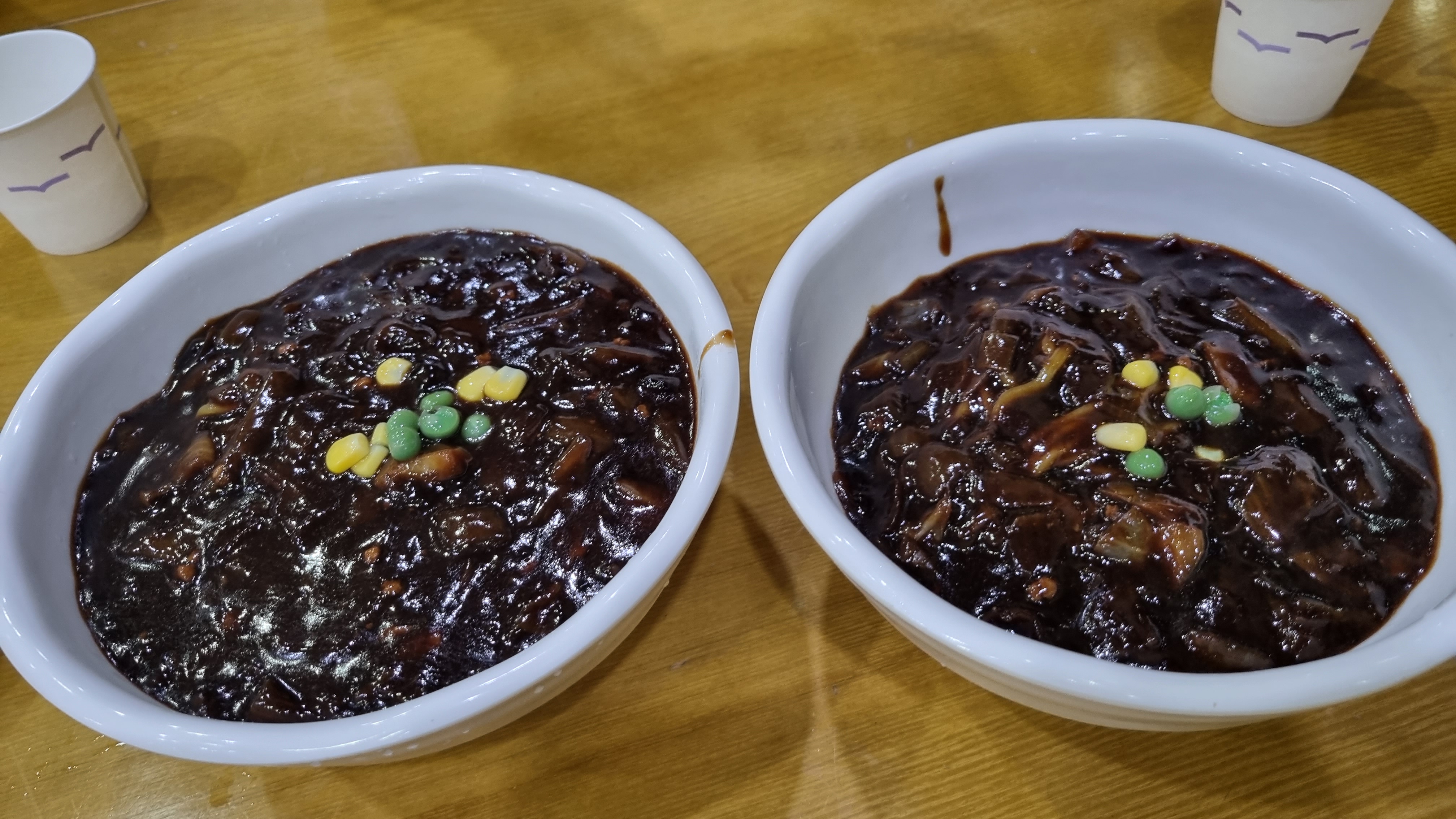 먼저 짜장이 나왔는데 위의 사진 2개의 사진이 조금 틀리는데 왼쪽 짜장이 양이 더 많습니다. 바로 곱빼기로 주문했는데 가격은 2천 원이 추가되어 9천 원입니다.