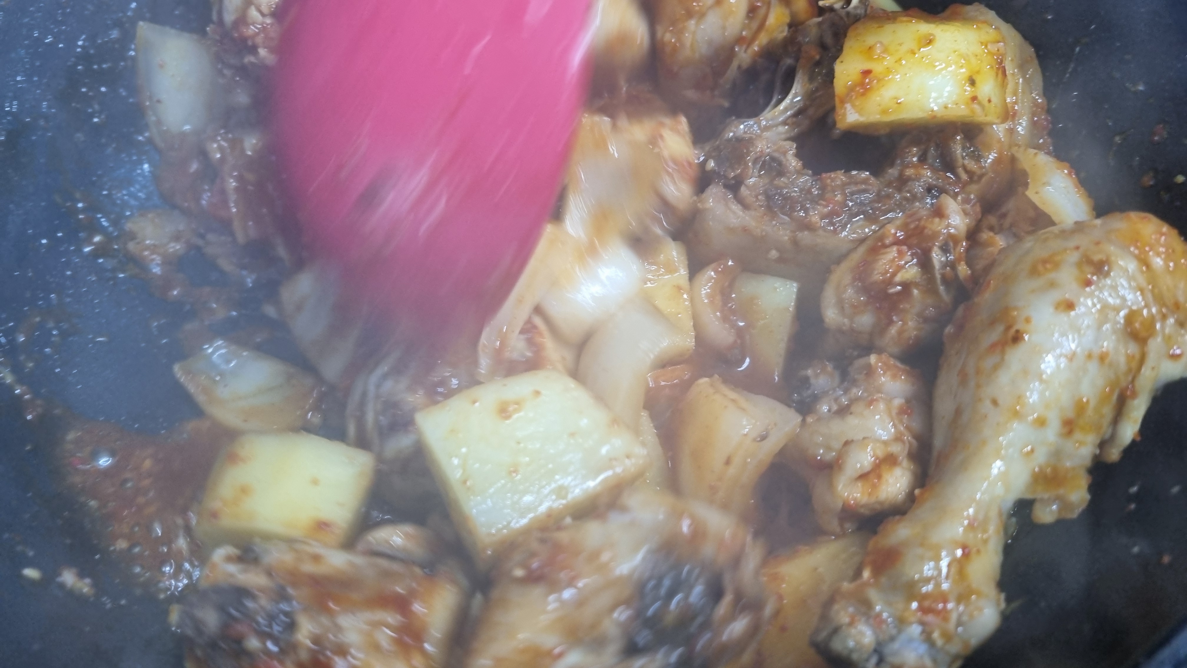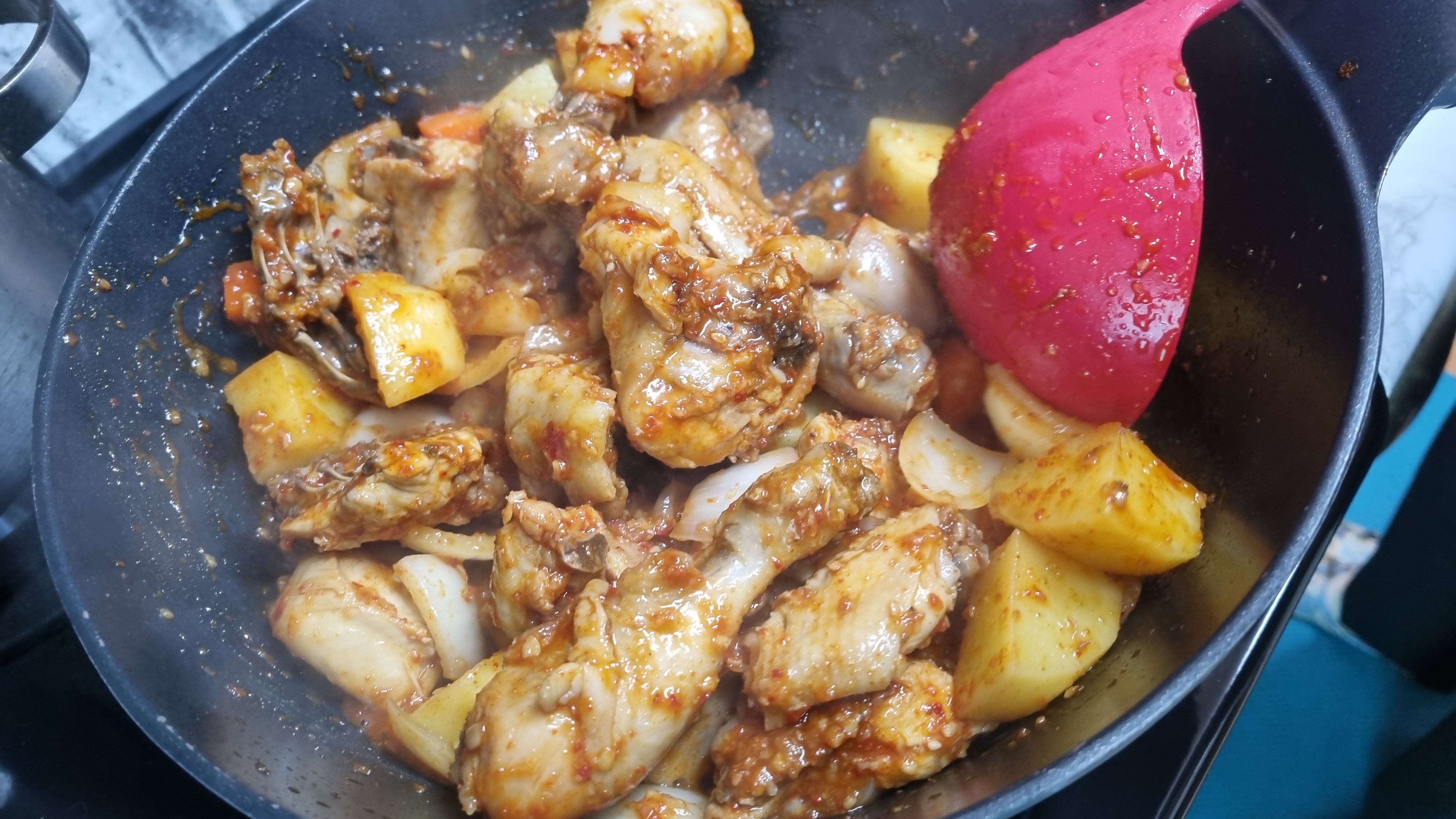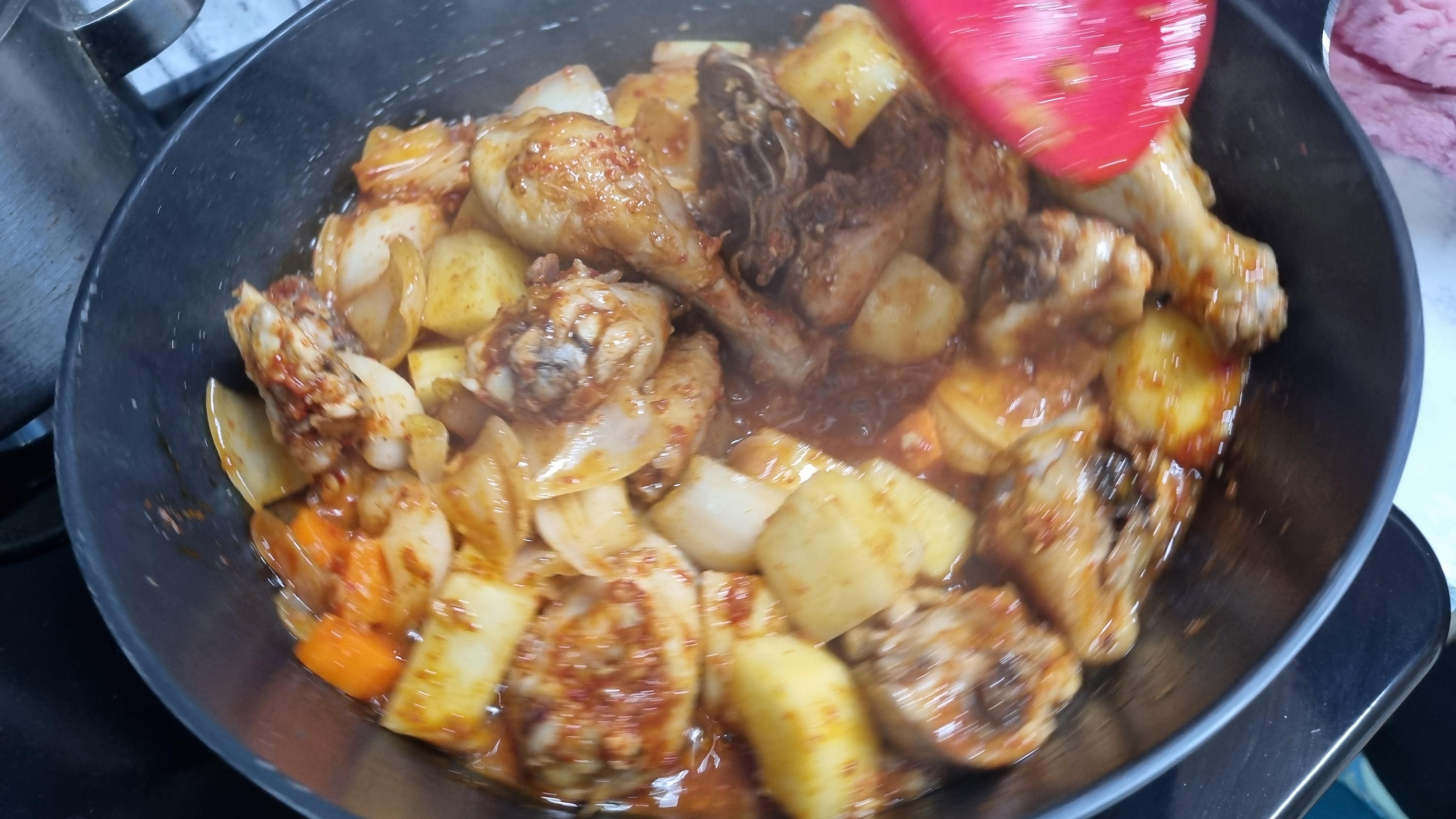 이어서 삶은 닭과 감자, 당근 양파와 고추장, 고춧가루등을 넣고 잘 혼합하여 주는데 혼합 후 20분 정도 숙성을 하시면 더 맛있는 볶음탕이 될 것입니다.