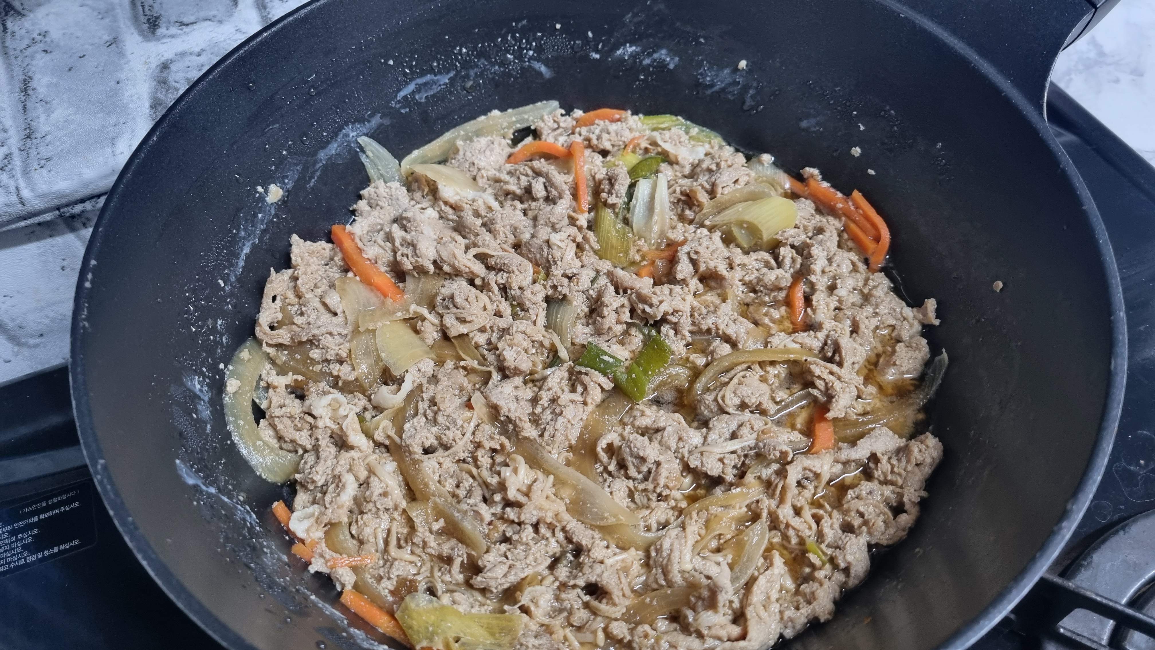 이때 주의할 점은 자주 뒤집어 주는 것이 좋습니다. 고기가 잘게 썰어져 있는데 서로 엉키는 경우도 있어 자주 저어 주면서 섞어주면서 볶으면 더 빨리 조리되고 맛있게 됩니다