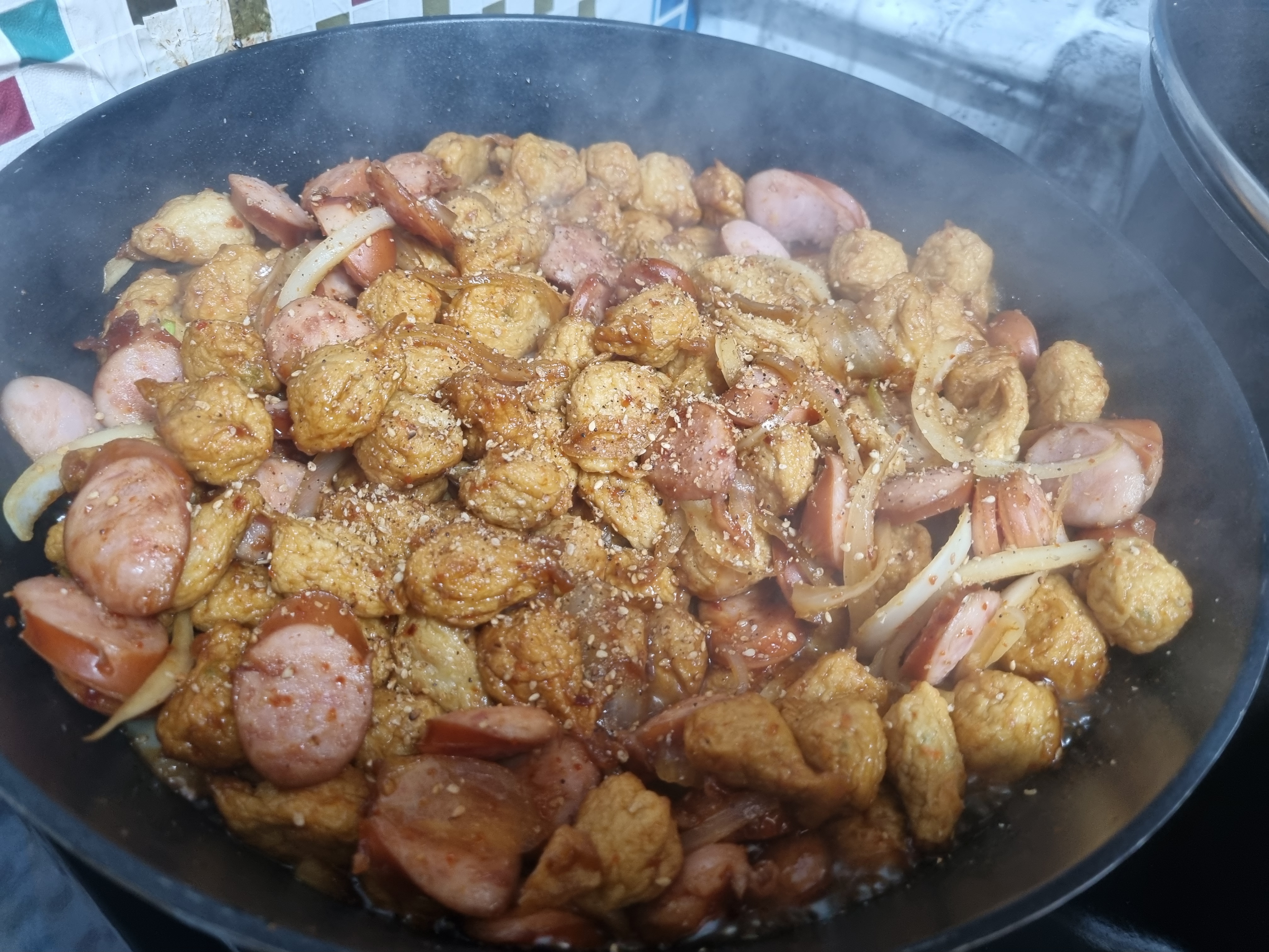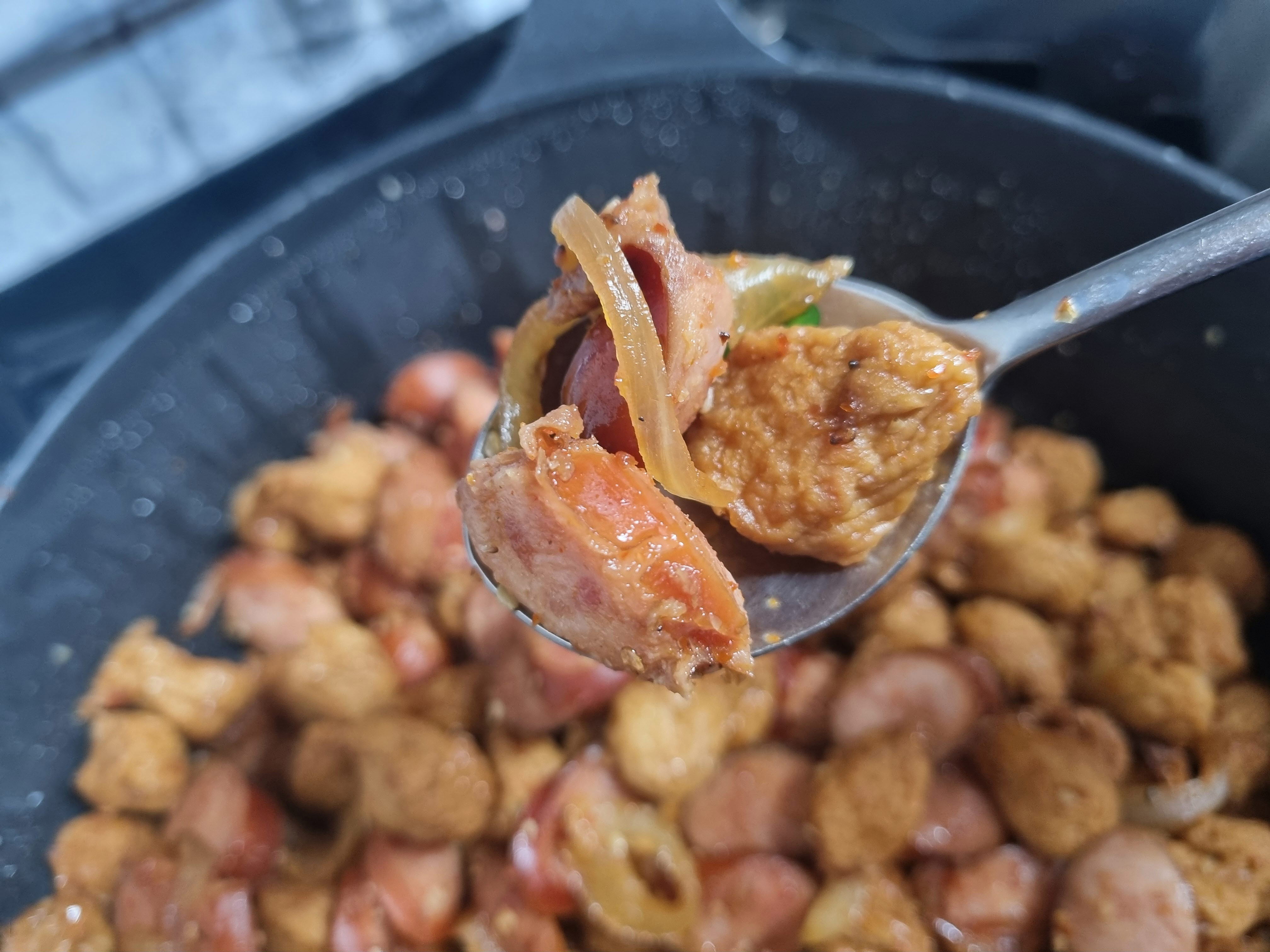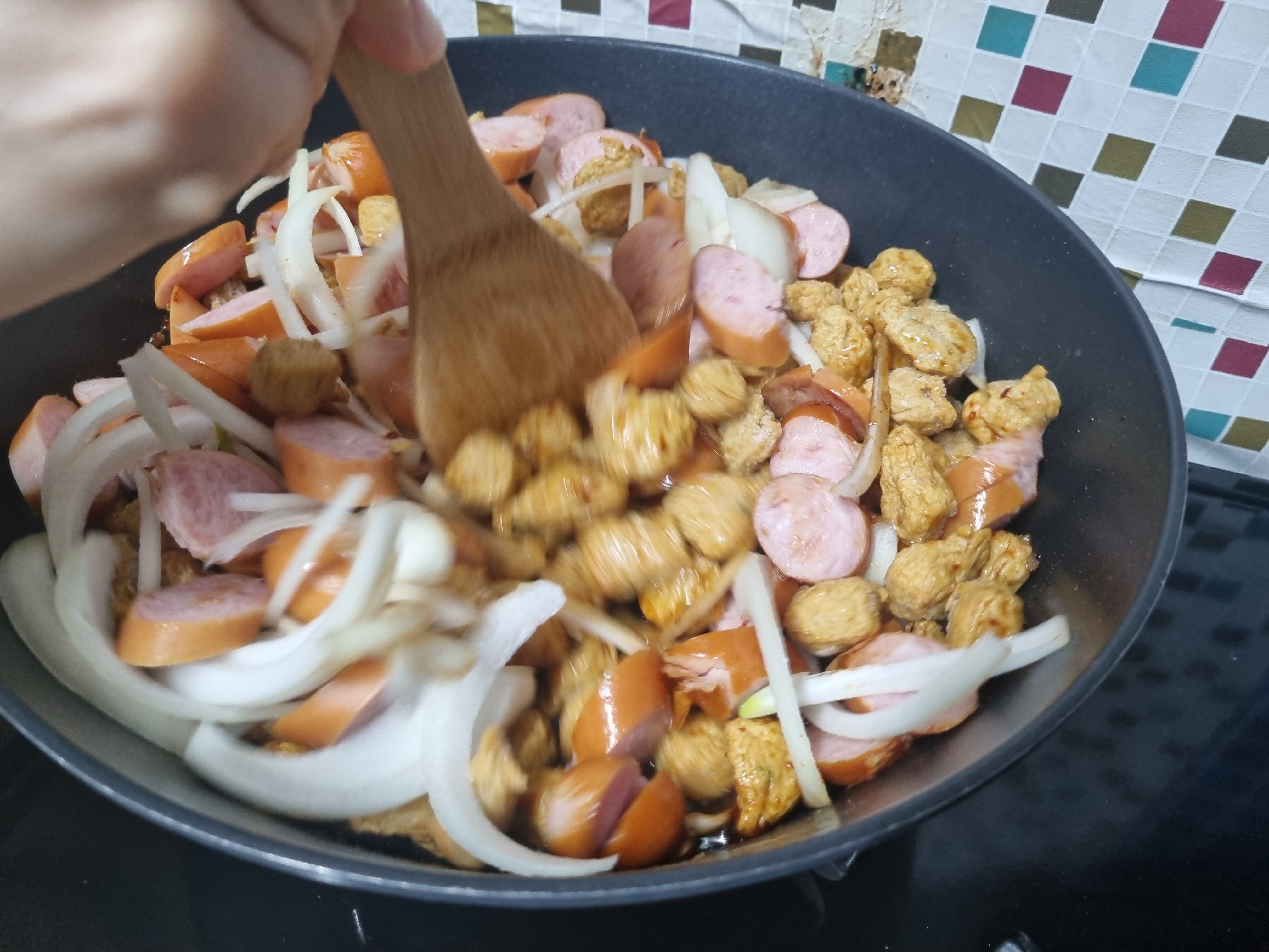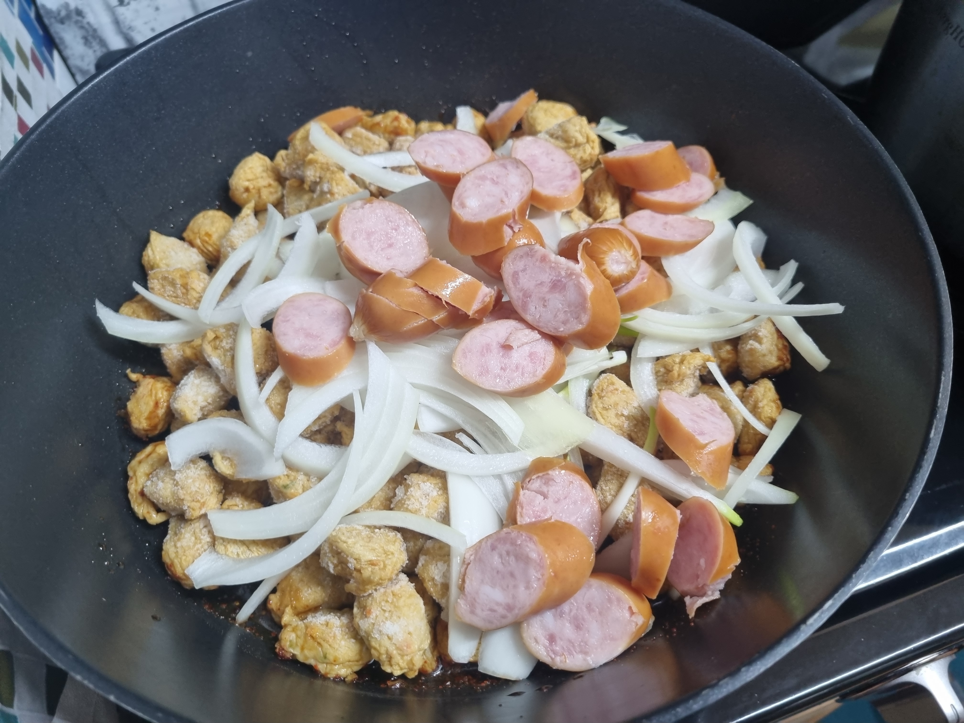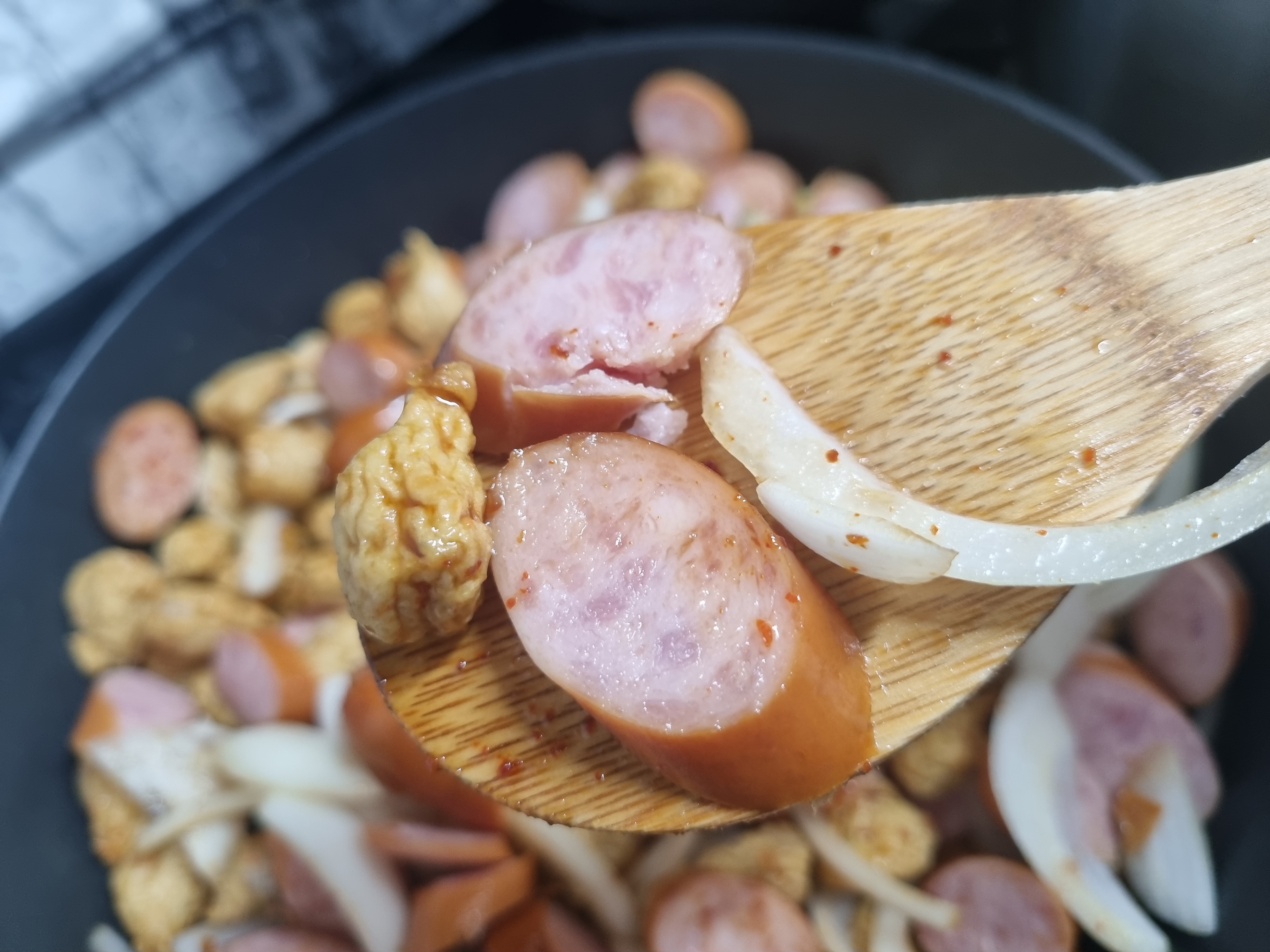 양념소스를 만들었으면 바로 어묵을 먼저 넣어주고 이어서 양파까지 넣습니다. 요리를 할 때 이때부터 천천히 저어주면서 만들어도 되는데 필자는 햄까지 모두 넣고 만들겠습니다.
