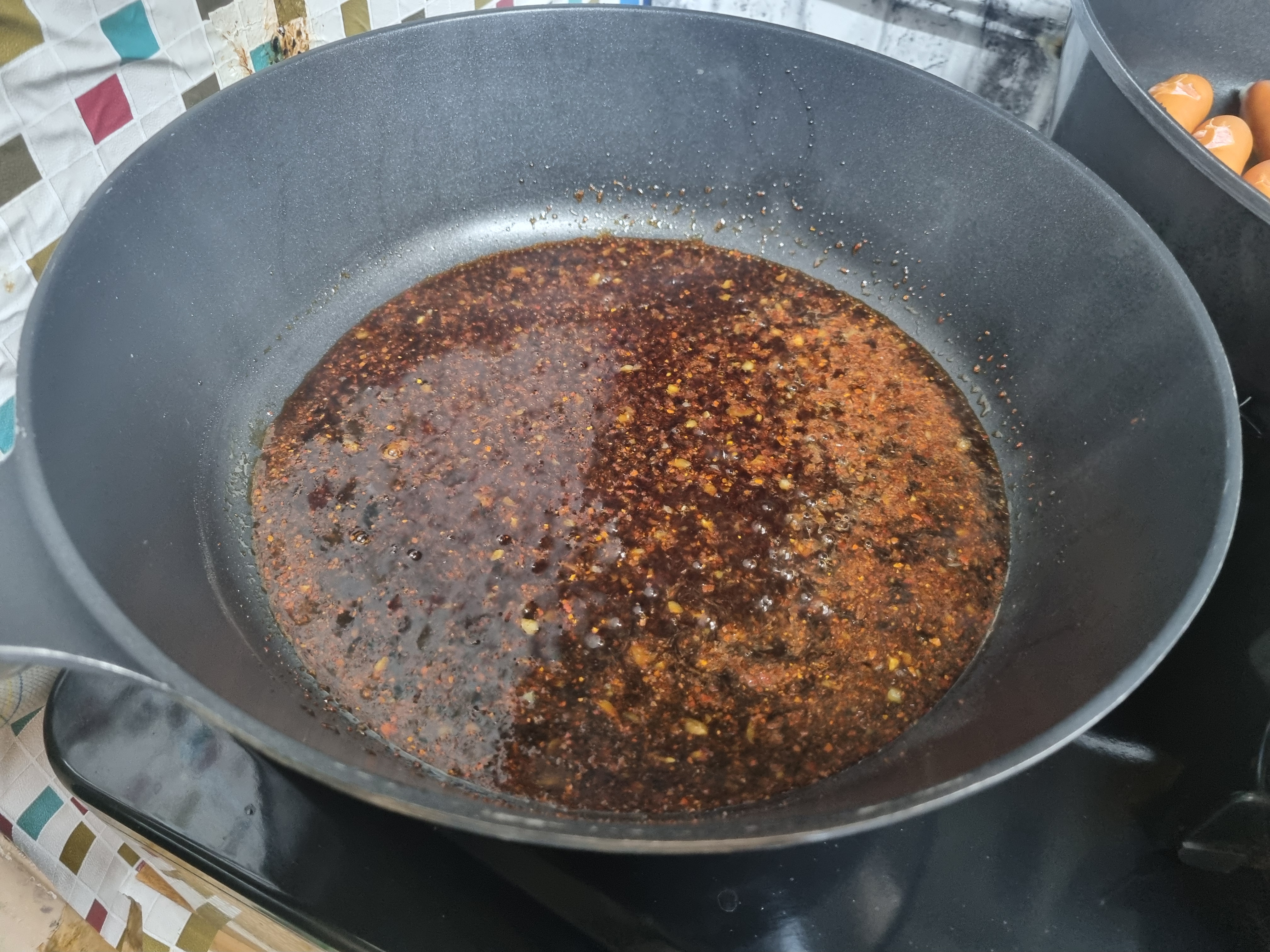 간장과 고추장,고추가루 다진 마늘을 넣고 물을 맥주컵 기준으로 1개 정도 넣어 끓이기 시작합니다. 끓이면서 다진 마늘을 넣고 다음으로 물엿을 넣어 조금 더 끓여줍니다.