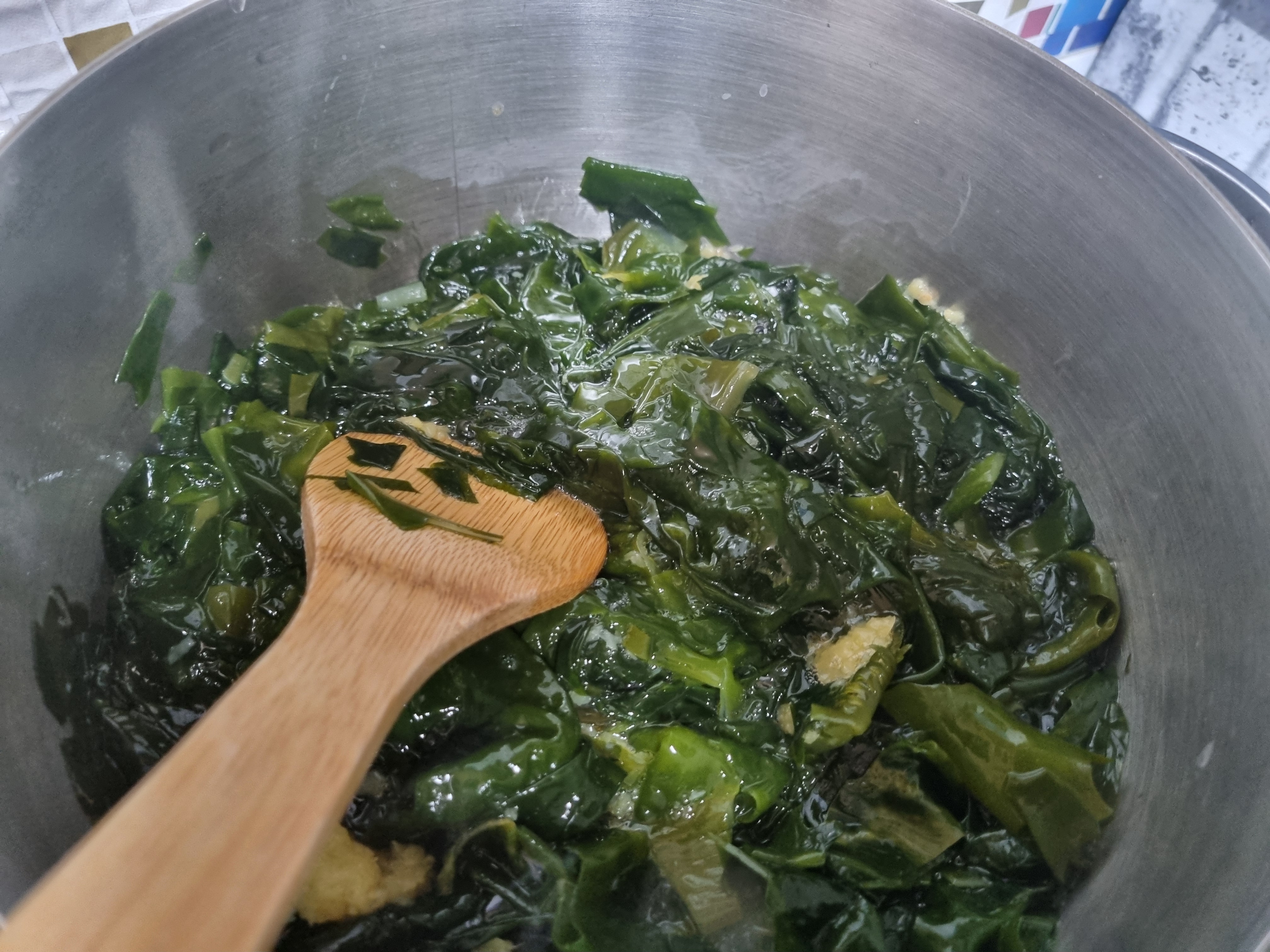 마른미역은 물에서 15분 정도 불린 후 물끼를 최대한 빼고 끓일 냄비에 넣습니다. 이어서 식용유를 한 수저 정도 넣어 살짝 볶아주기 시작합니다.