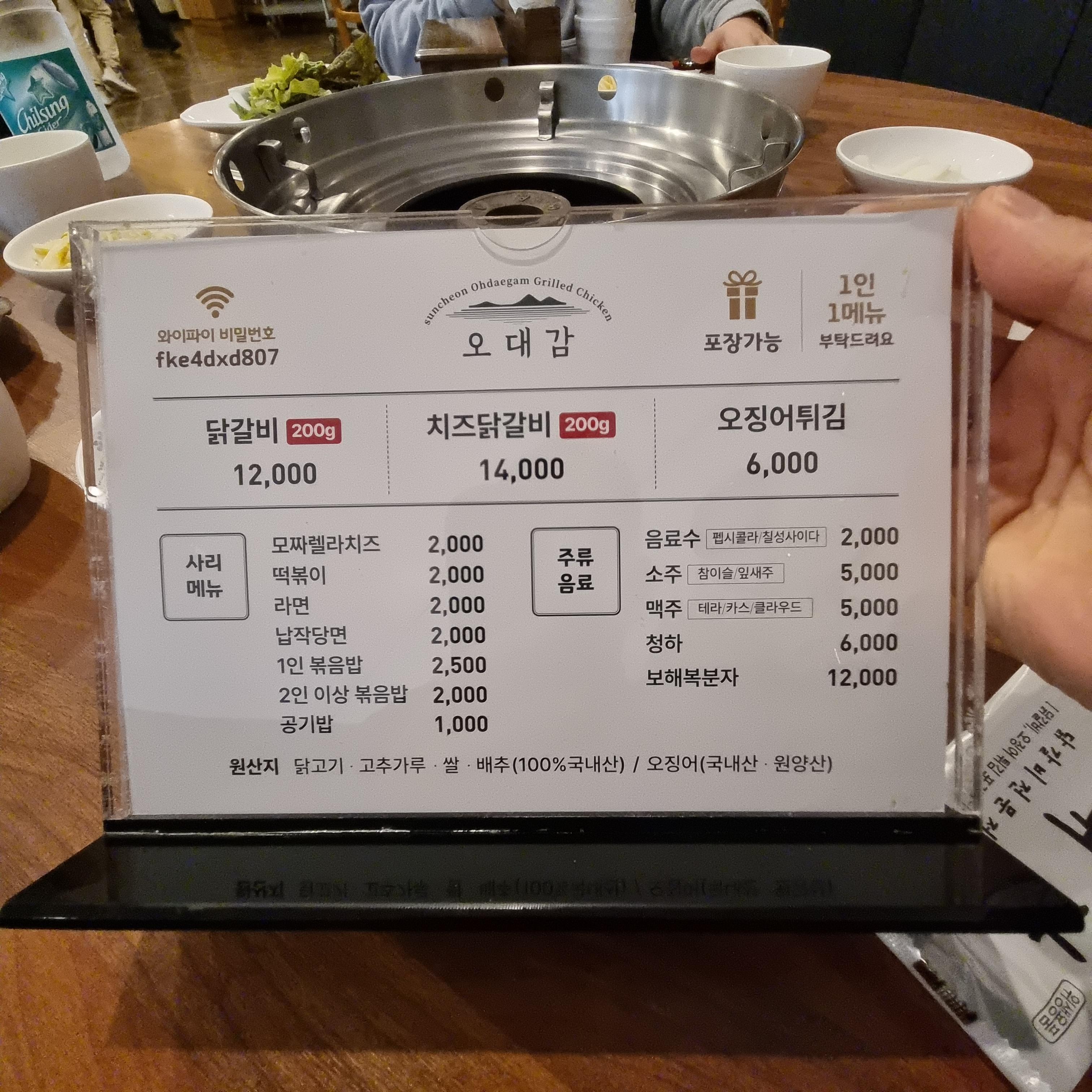 닭갈비 메뉴표인데 일반 닭갈비가 1인분 200g에 12,000원이며 치즈닭갈비는 14,000원으로 주요 메뉴는 이 두 가지로 골라 드시면 됩니다.
