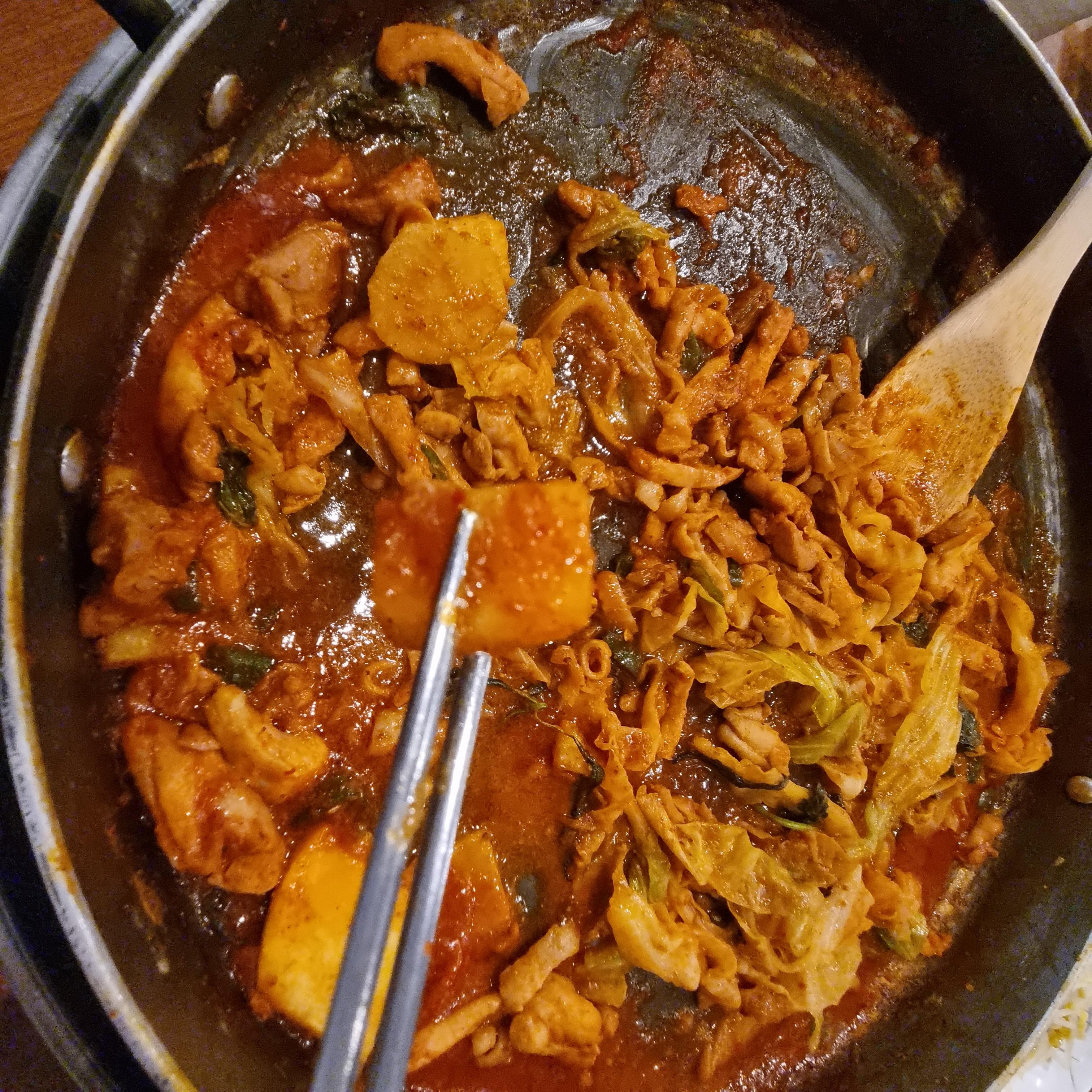 라면사리를 끓이는데 주문 시 미리 한번 삶아져 나와 여기에서는 닭갈비 양념이 잘 혼합되도록 하면서 다시 한번 살짝 삶아주는 과정을 거치면 됩니다.
