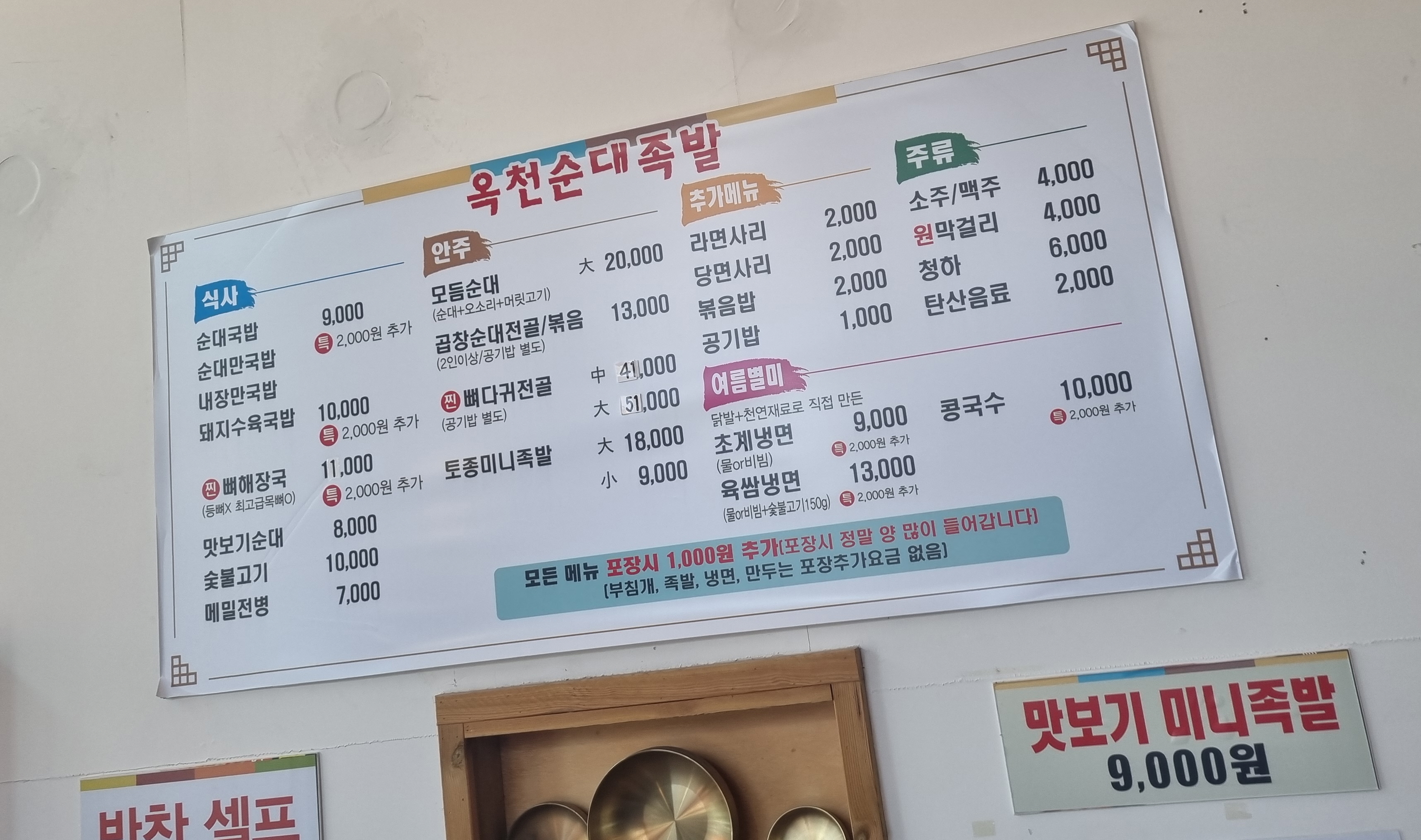 국밥과 순대 족발로 주요메뉴가 구성되어 있는데 순대국밥이 9천 원, 뼈다귀해장국이 11,000원에 판매되고 있으며 양이 적은 맛보기 순대는 8천 원 정식 순대는 2만 원입니다.