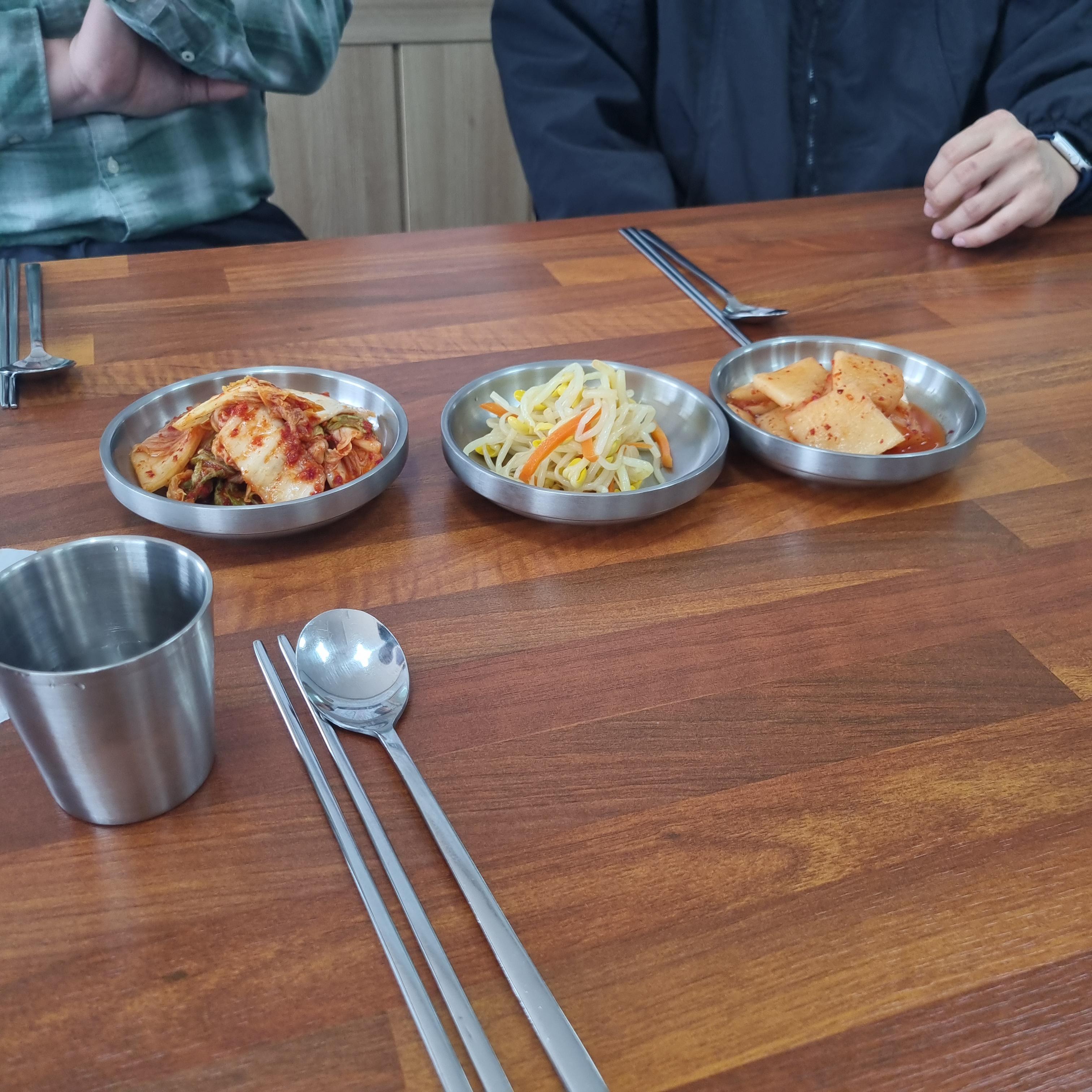 기본반찬은 3종류가 나오는데 아주 조금씩 나오며 필요시 리필이 가능합니다. 식당에 가면 큰 접시에 반찬의 양이 너무 많아도 부담되고 남기면 재생용 되는 걱정이 되어 오히려 이렇게 작게 나온 것이 더 좋습니다.