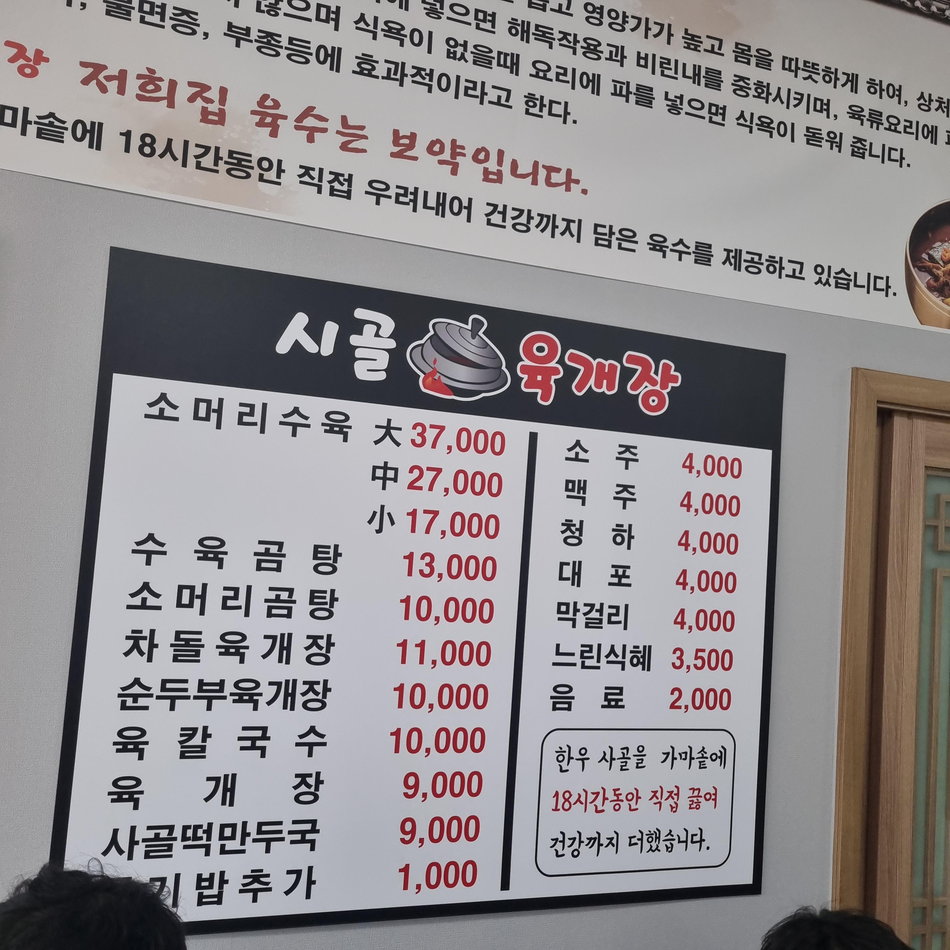 이곳의 메뉴판인데 곰탕과 육개장 위주로 메뉴가 구성되어 있습니다. 회식을 하면 소머리수육도 있는데 가격은 대,중,소로 37,000원, 27,000원, 17,000원에 판매됩니다.