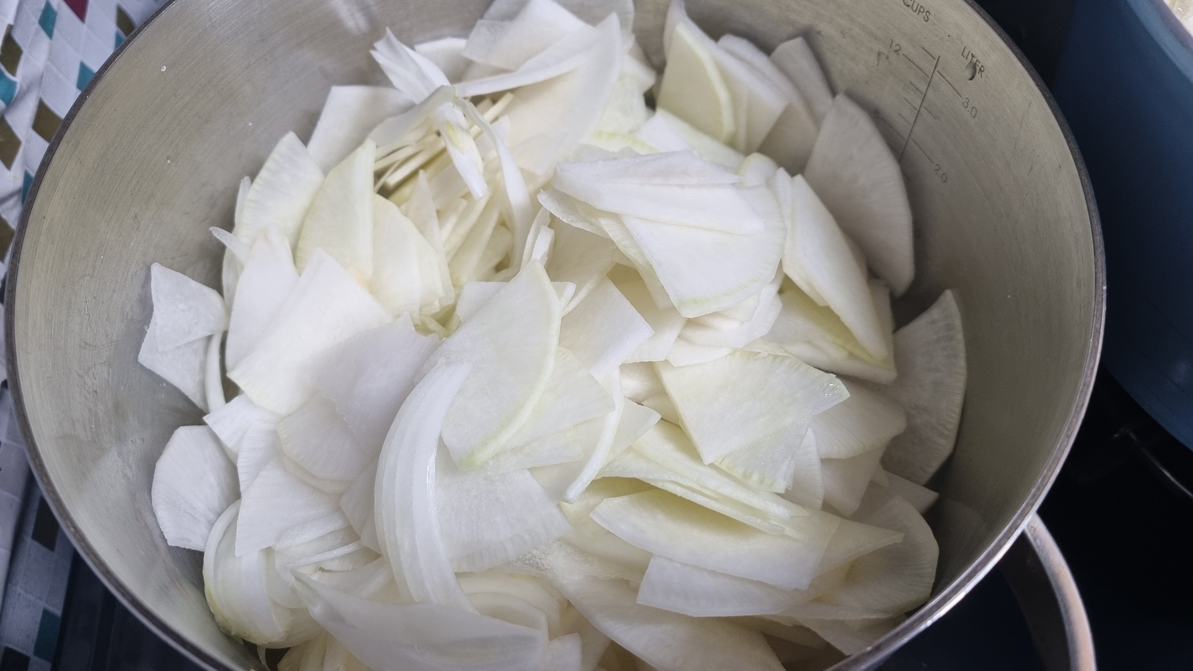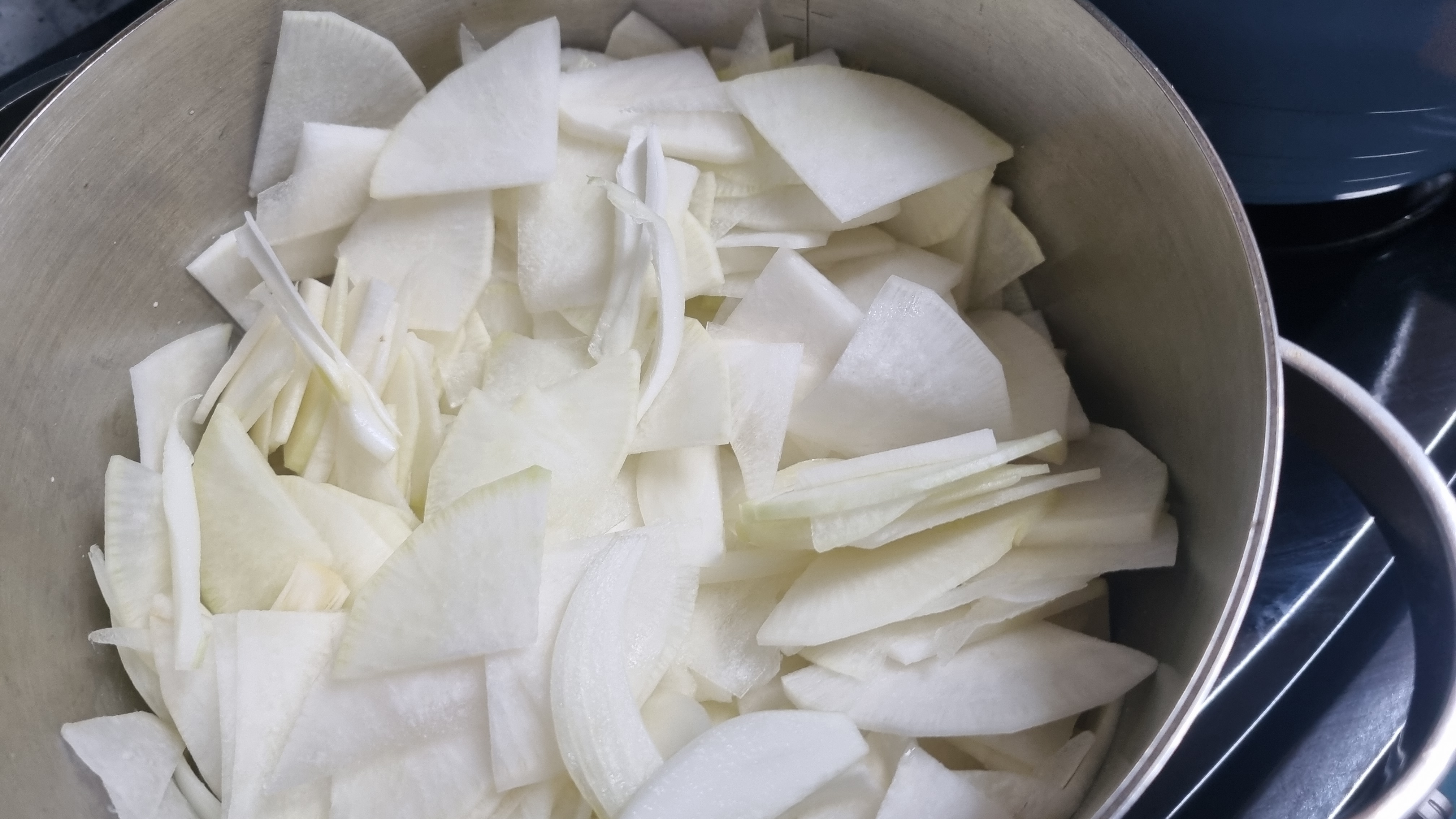 먼저 무와 양파를 썰어 냄비에 넣습니다.
