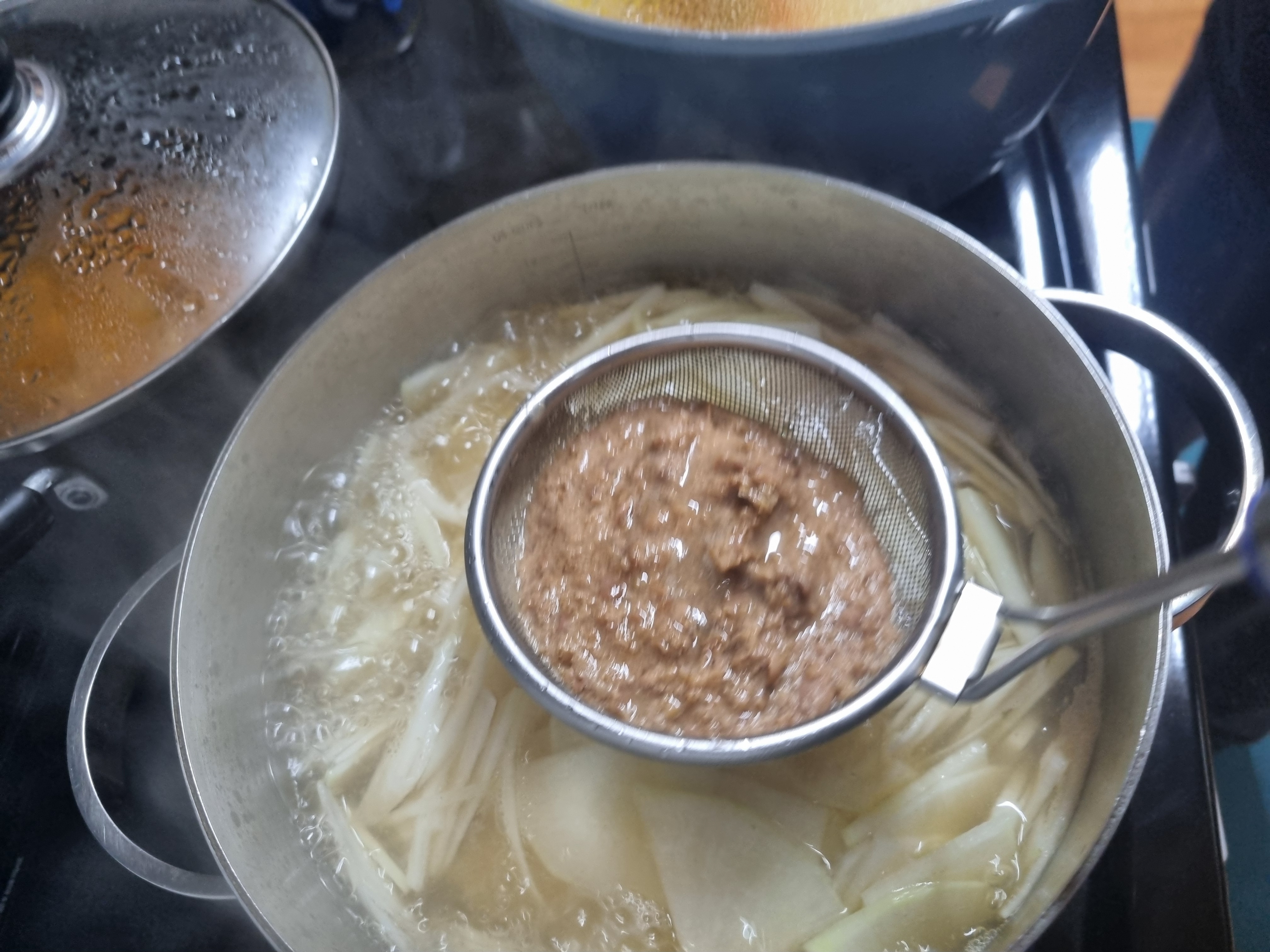 된장은 물의 양에 따라 약간씩 달라질 수 있으며 된장을 그래로 넣어 풀어줘도 되고 조그만한 그릇에 먼저 잘 풀고 이어서 체망등에 넣어 덩어리를 걸러주면서 넣어주어도 됩니다.