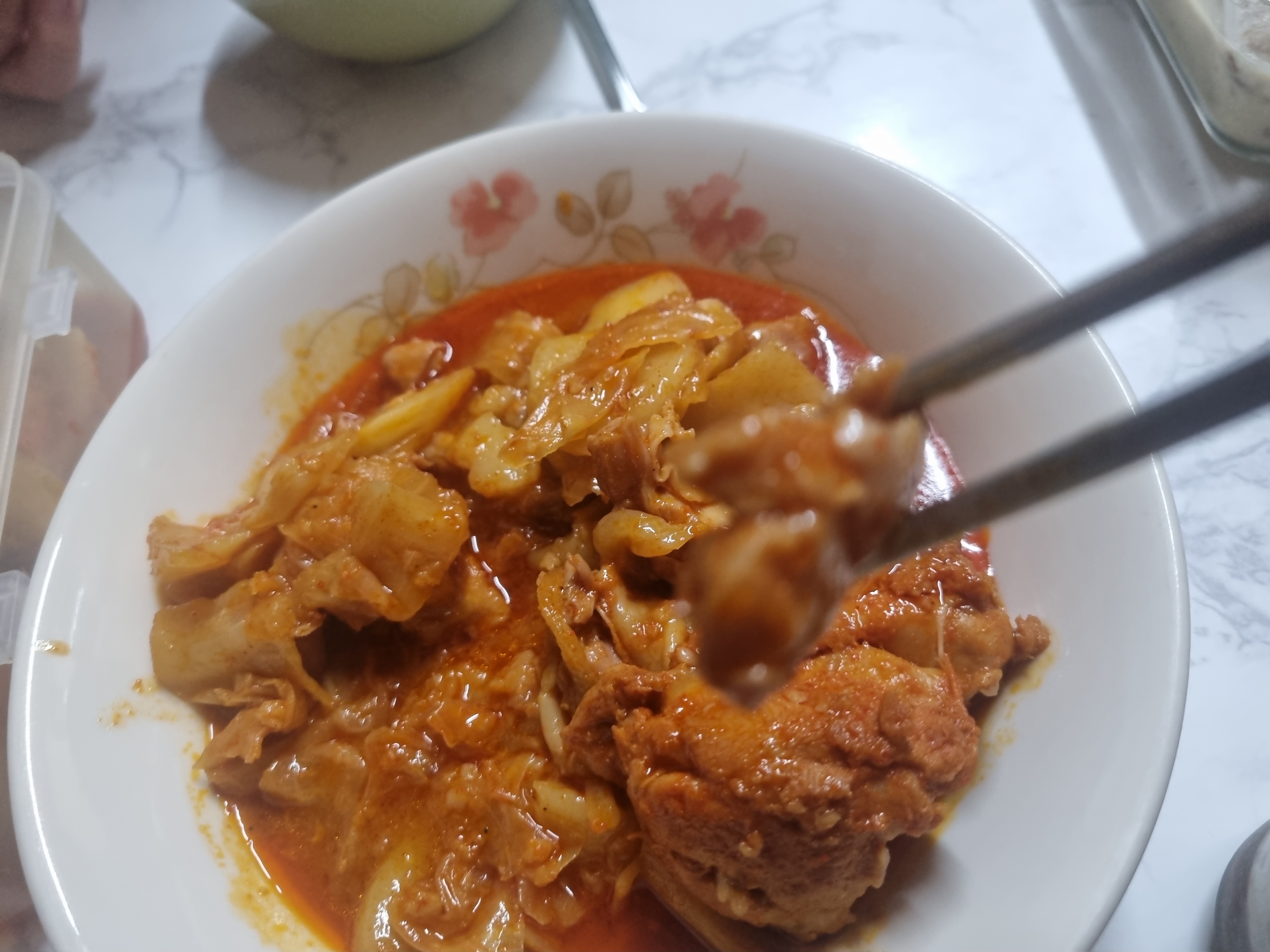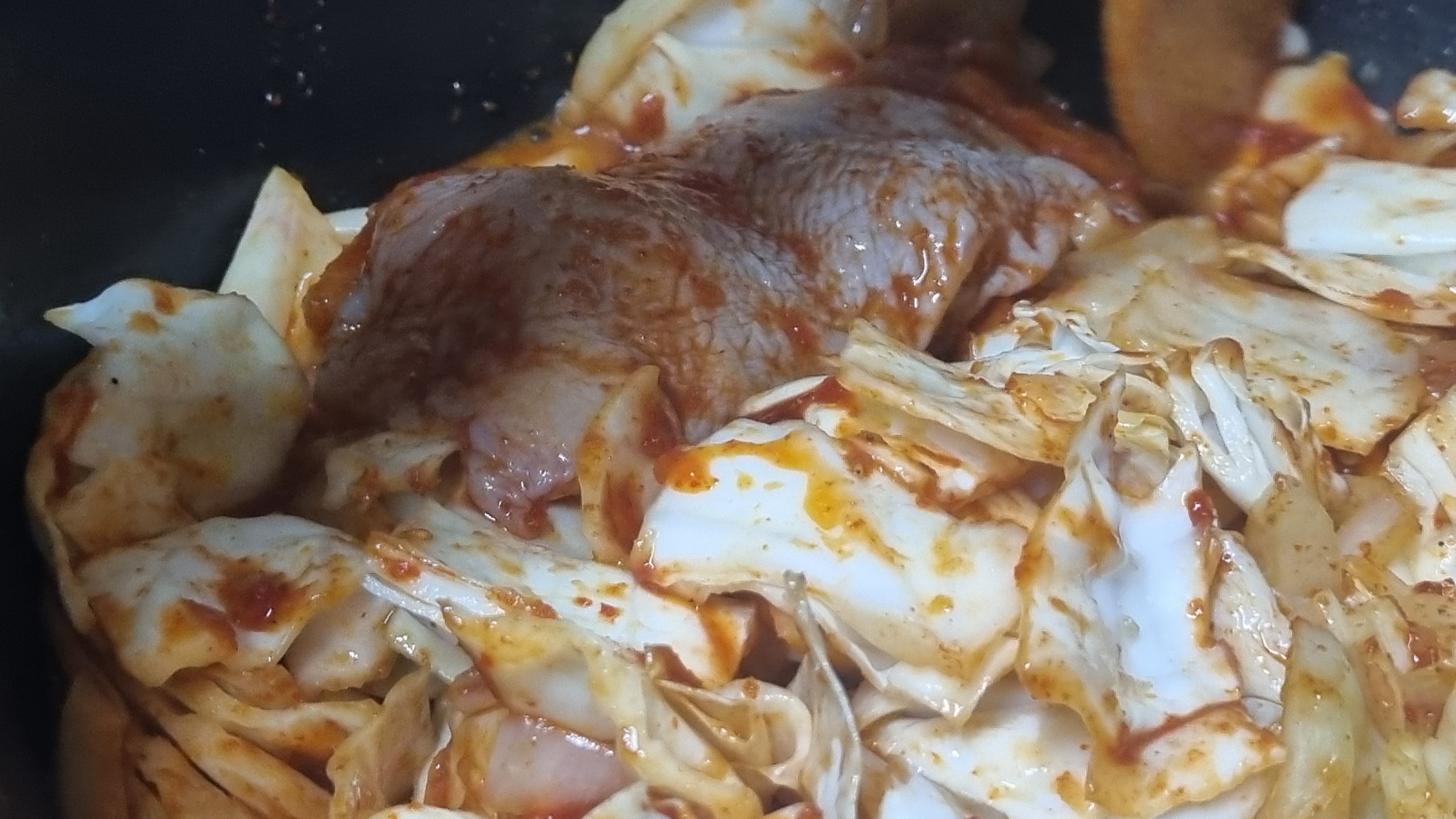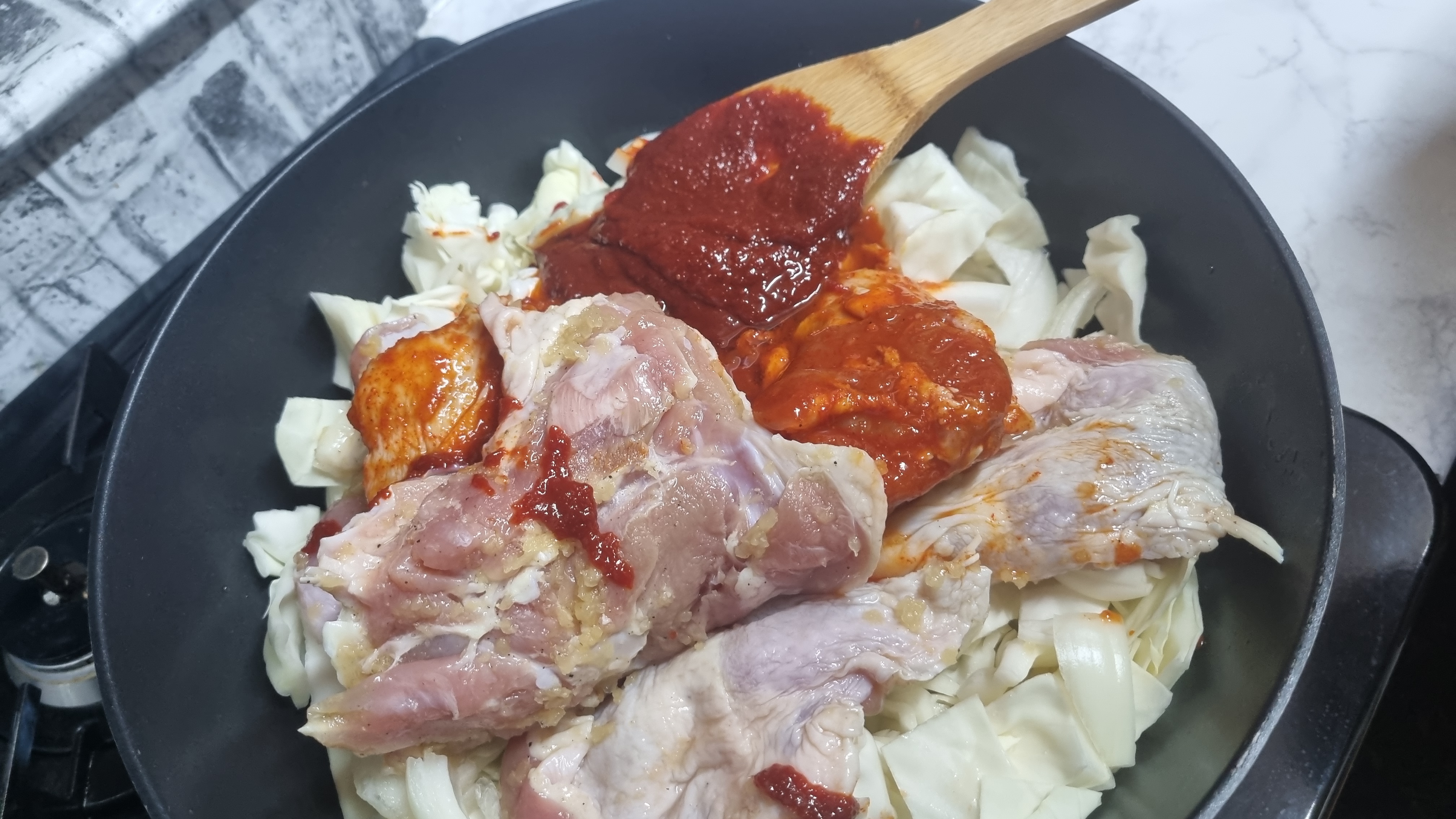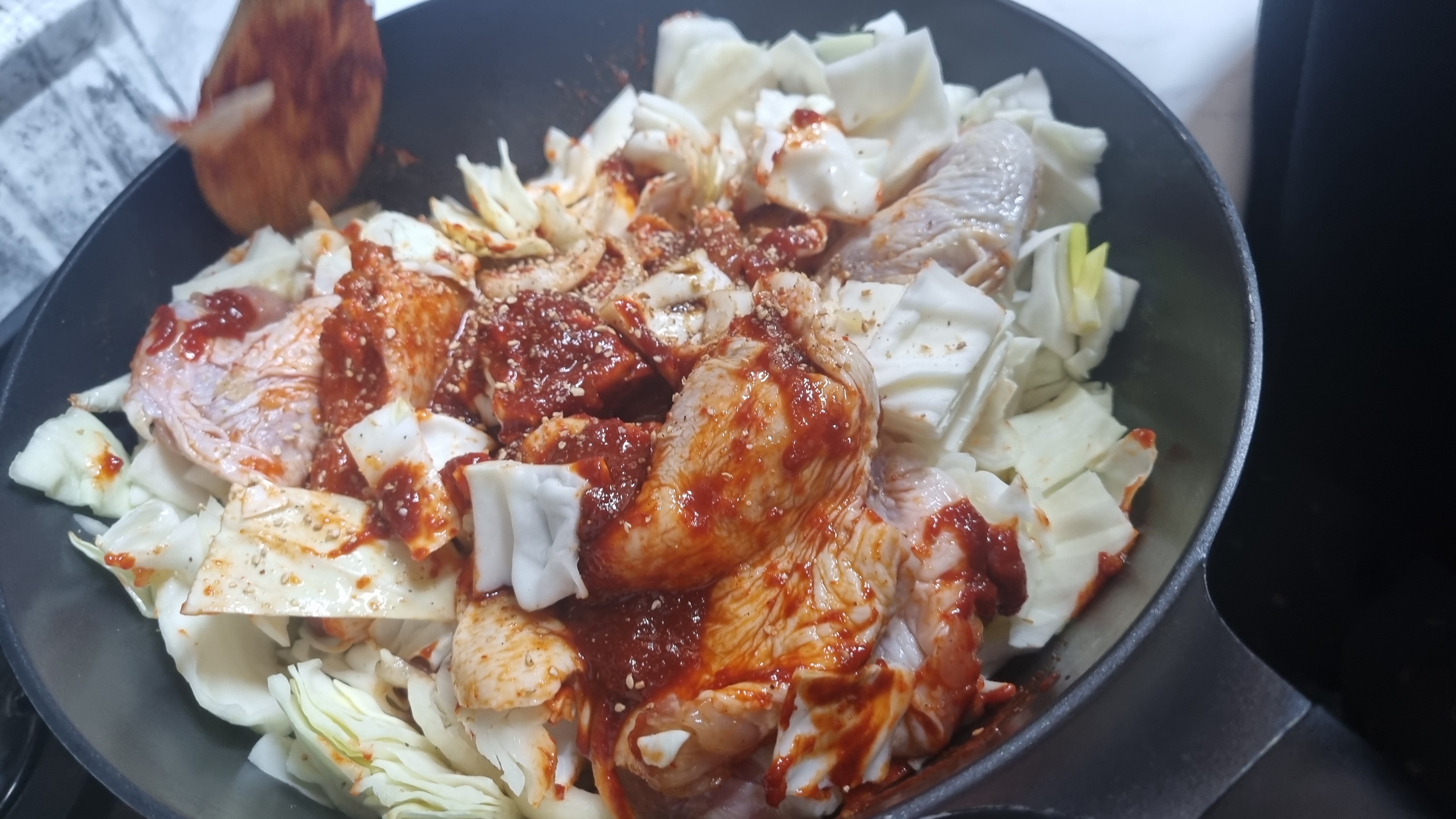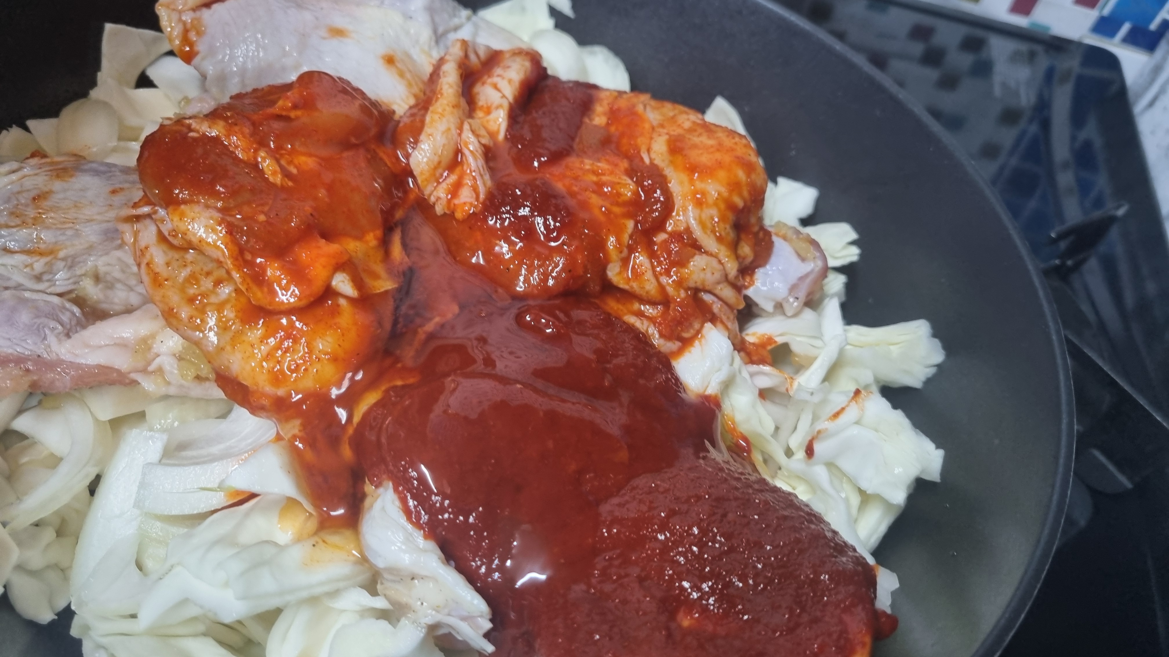 이어서 닭고기를 넣어야 하는데 양념이 된 닭갈비와 양념이 되지 않은 것을 함께 넣어 집에서 준비한 양념을 추가로 넣어야 합니다.