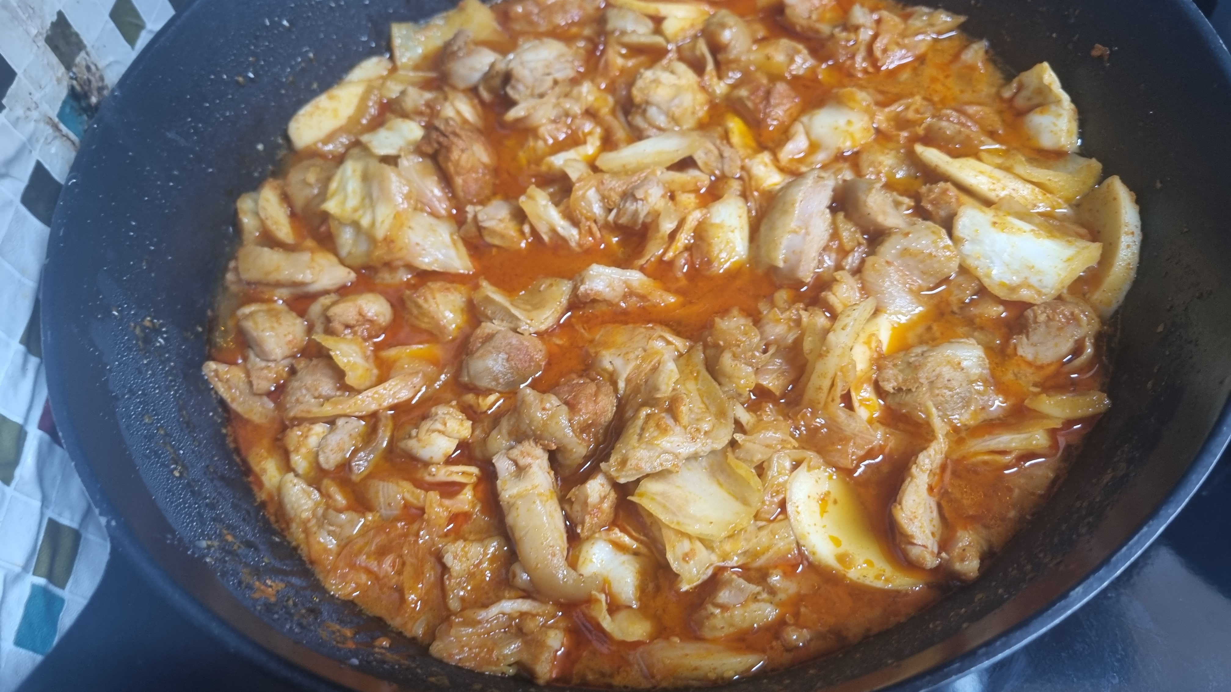 이후 서서히 끓기 시작하고 볶아지면 가스렌인지 불을 중간으로 하고 뚜껑을 닫고 열고 저어주면서 볶으면 물이 많이 생기면서 닭갈비가 볶아지는데 끓은 후 약 5분 정도가 지나면 큰 덩어리의 닭갈비를 잘라주기 시작합니다.
