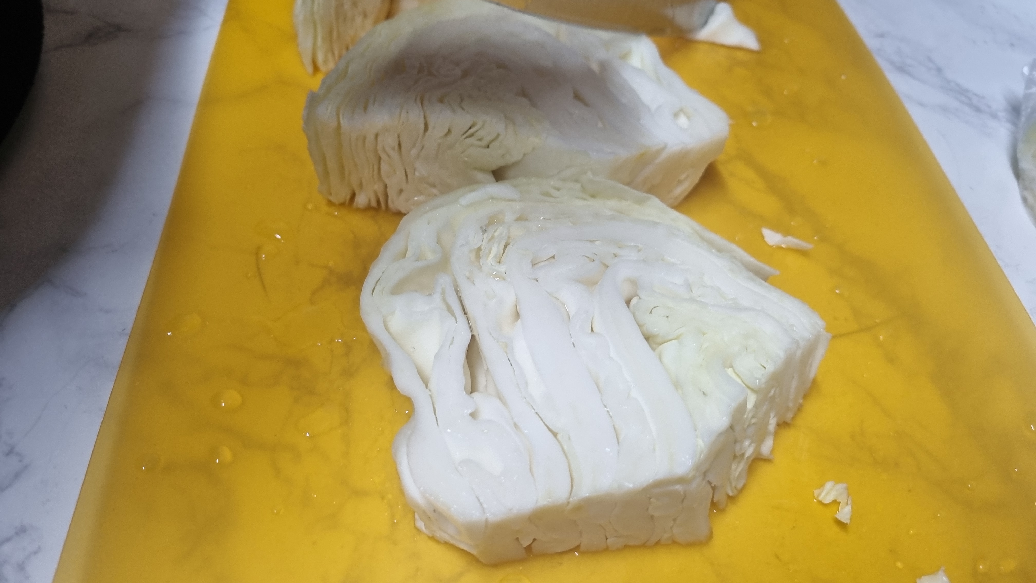 양배추를 썰어야 하는데 길게 자르는 것보다 사각을 자르는 것이 더 맛있고 요리하기도 편리합니다.