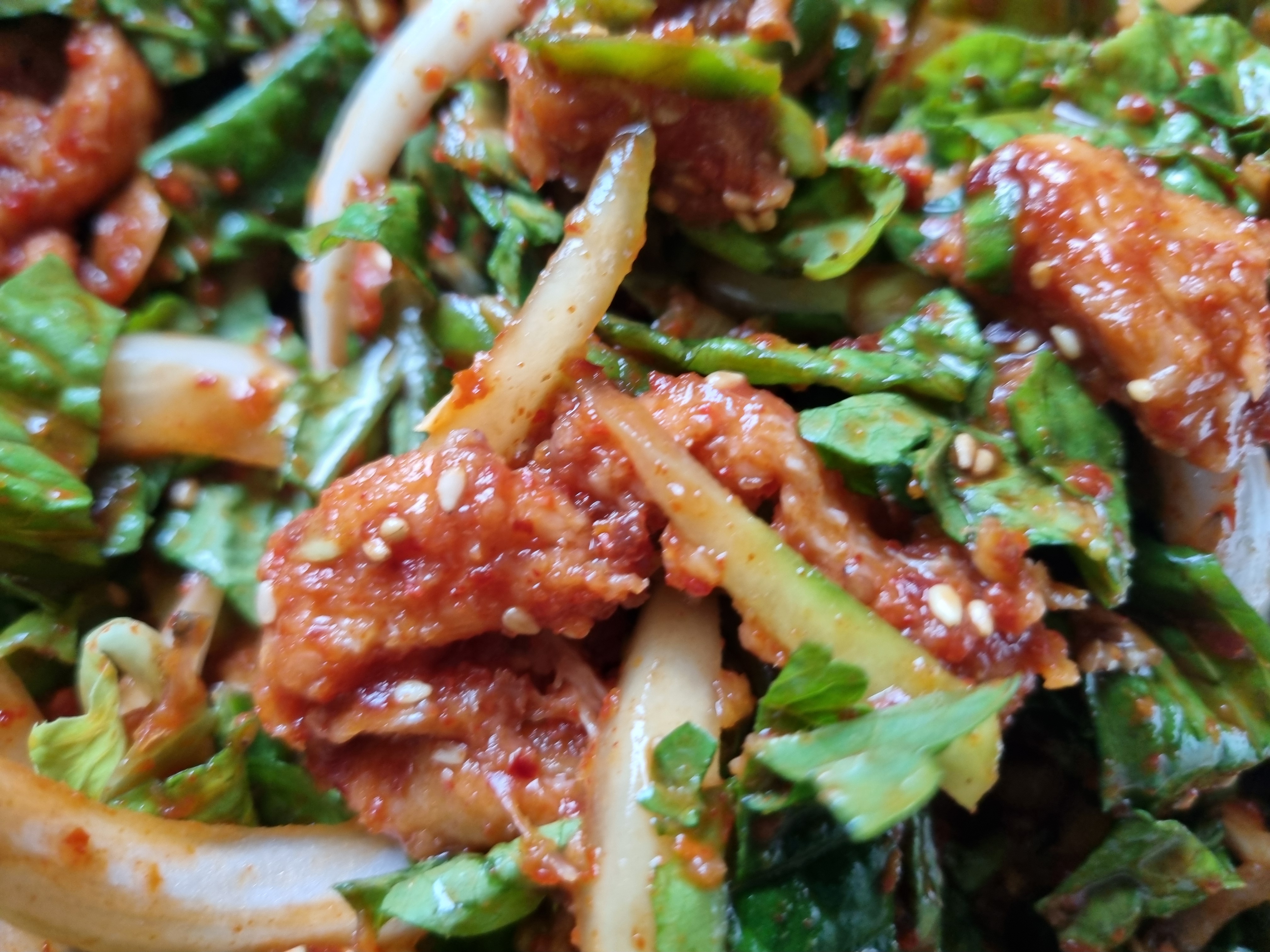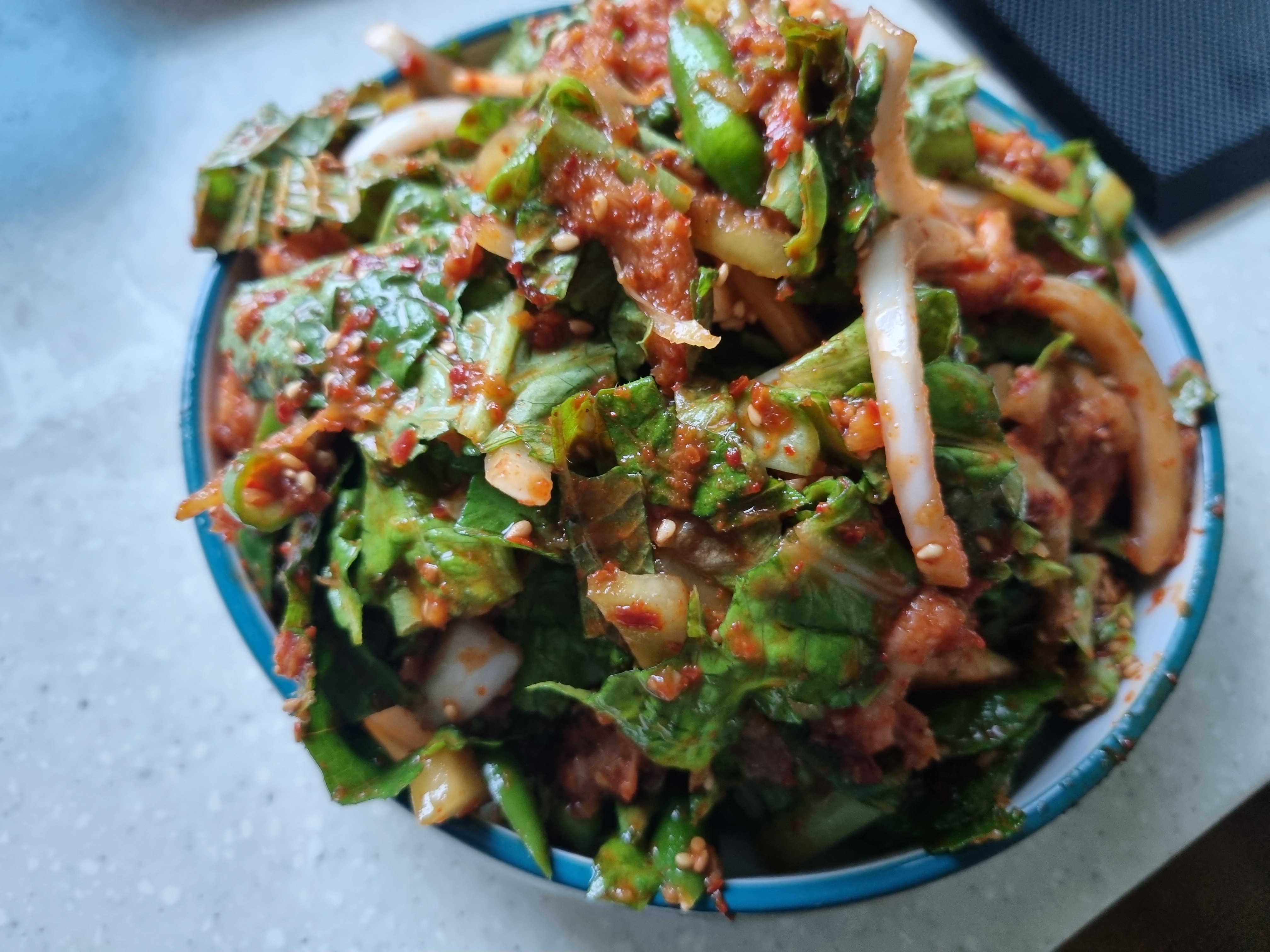 대부분의 재료를 손질하여 놓은 상태입니다. 상추나 깻잎도 잘게 썰어 놓았고 이제는 식초와 고추장, 고춧가루등의 양념을 넣어 잘 혼합하면 됩니다.