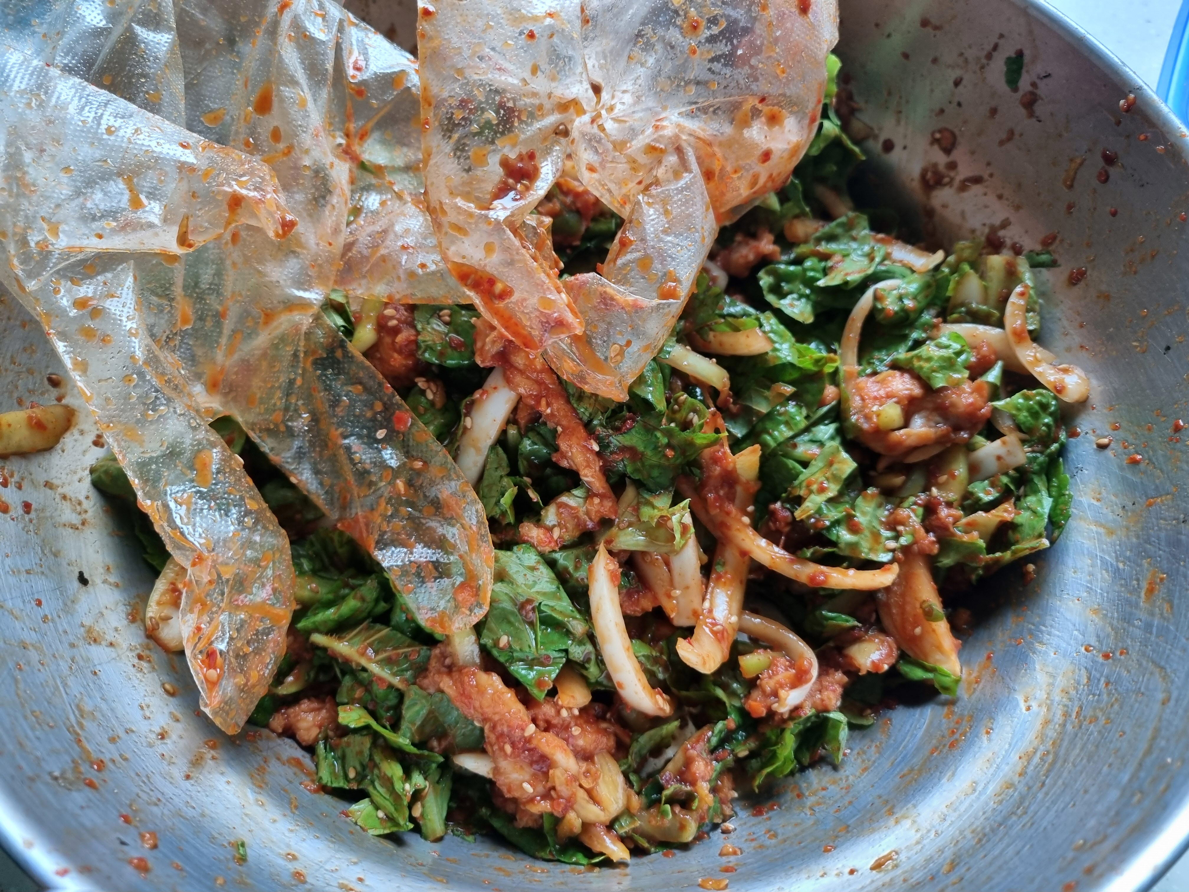 드디어 양념을 넣었는데 먼저 고추장을 넣고 이후 고춧가루를 넣었으며 계속해서 식초를 넣었습니다. 1회용 비닐장갑을 착용하고 잘 혼합해 주어야 합니다.