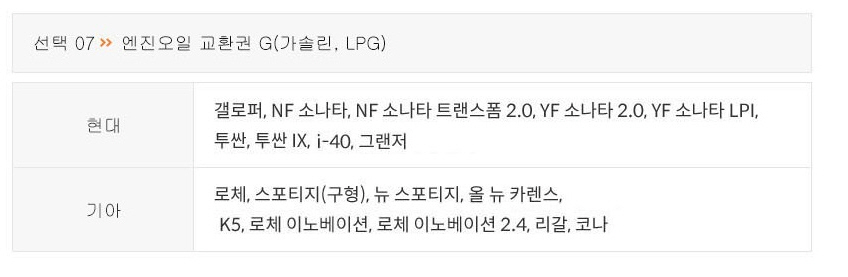 7번은 많이 타는 차종으로 가솔린, LPE차량으로 소나타, 갤러퍼, 투산, 뉴스포티지 등에 해당하며 가격은 47,900원입니다.
