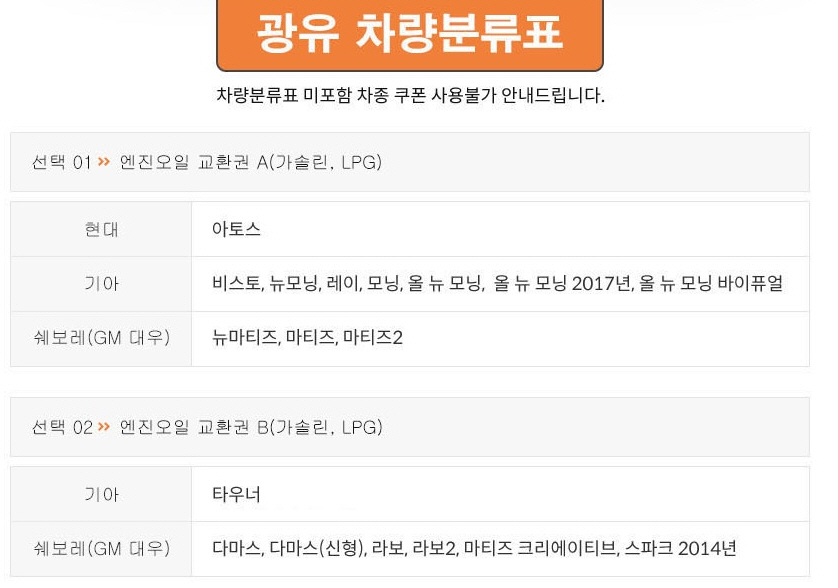 선택 1번은 모닝이나 비스토, 마티즈 등 경차 위주입니다, 가격은 34,400원입니다. 이 정도면 상당히 저렴하는데 일반 카센터에서 교환하는 것보다 확실히 저렴합니다.