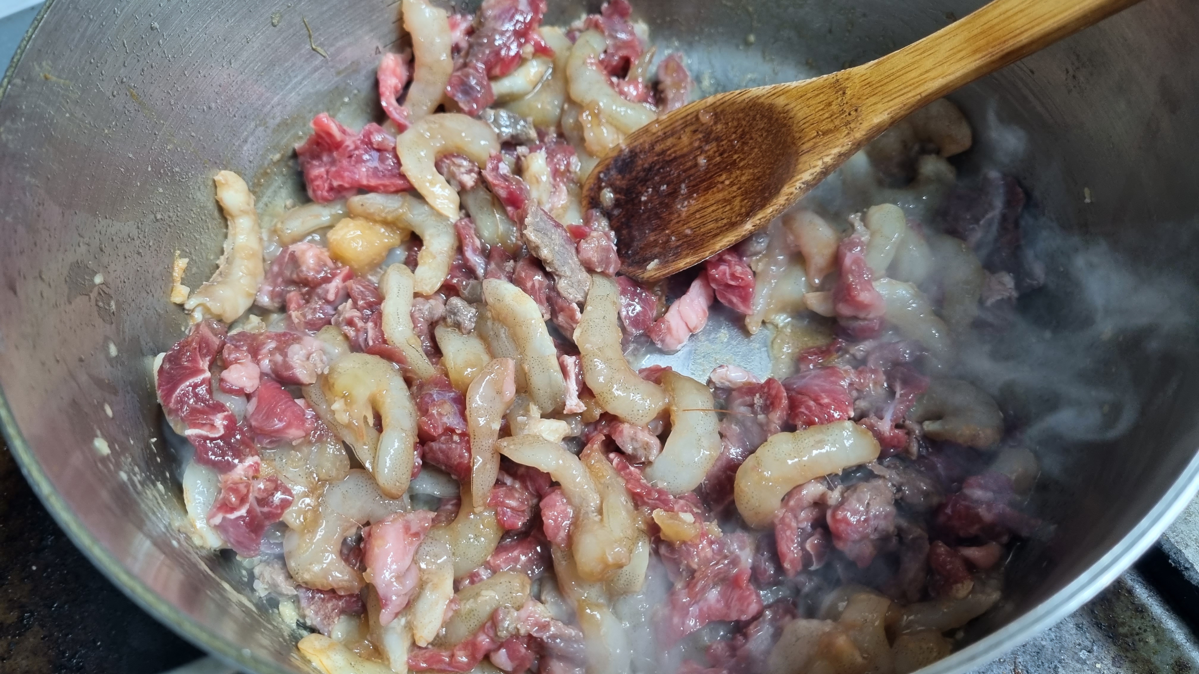 물에 불린 미역의 물끼를 최대한 빼주고 이것을 살짝 볶은 소고기가 있는 냄비에 넣어 가스렌인지나 인덕션 불을 중간으로 하고 다시 볶아줘야 합니다.