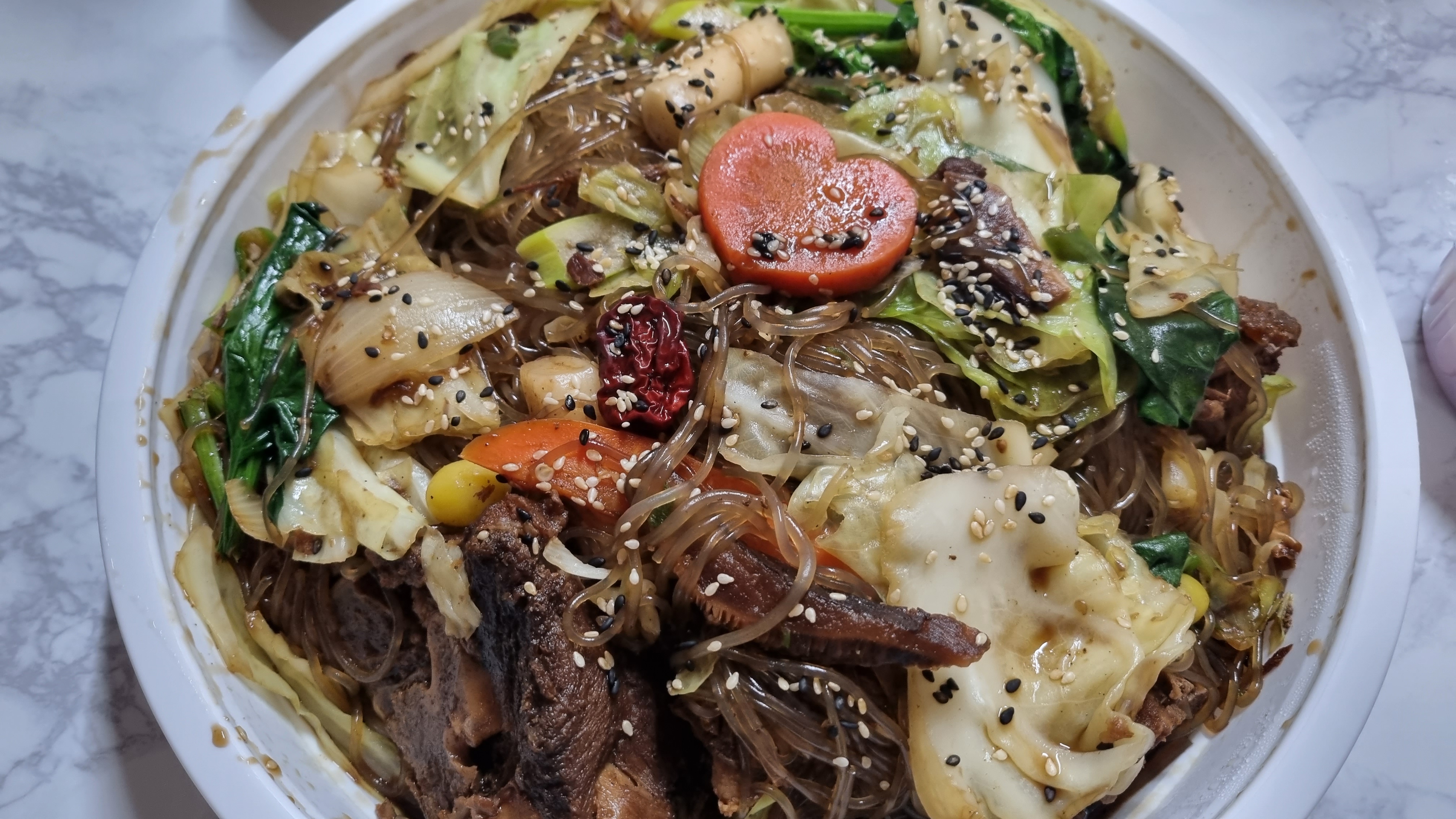뚜껑을 열었는데 정말 푸짐하게 보입니다. 감자뼈와 당면, 그리고 여러 가지 채소와 양념으로 만들어졌는데 먹음직스럽게 보이는 것이 한눈에 들어옵니다.