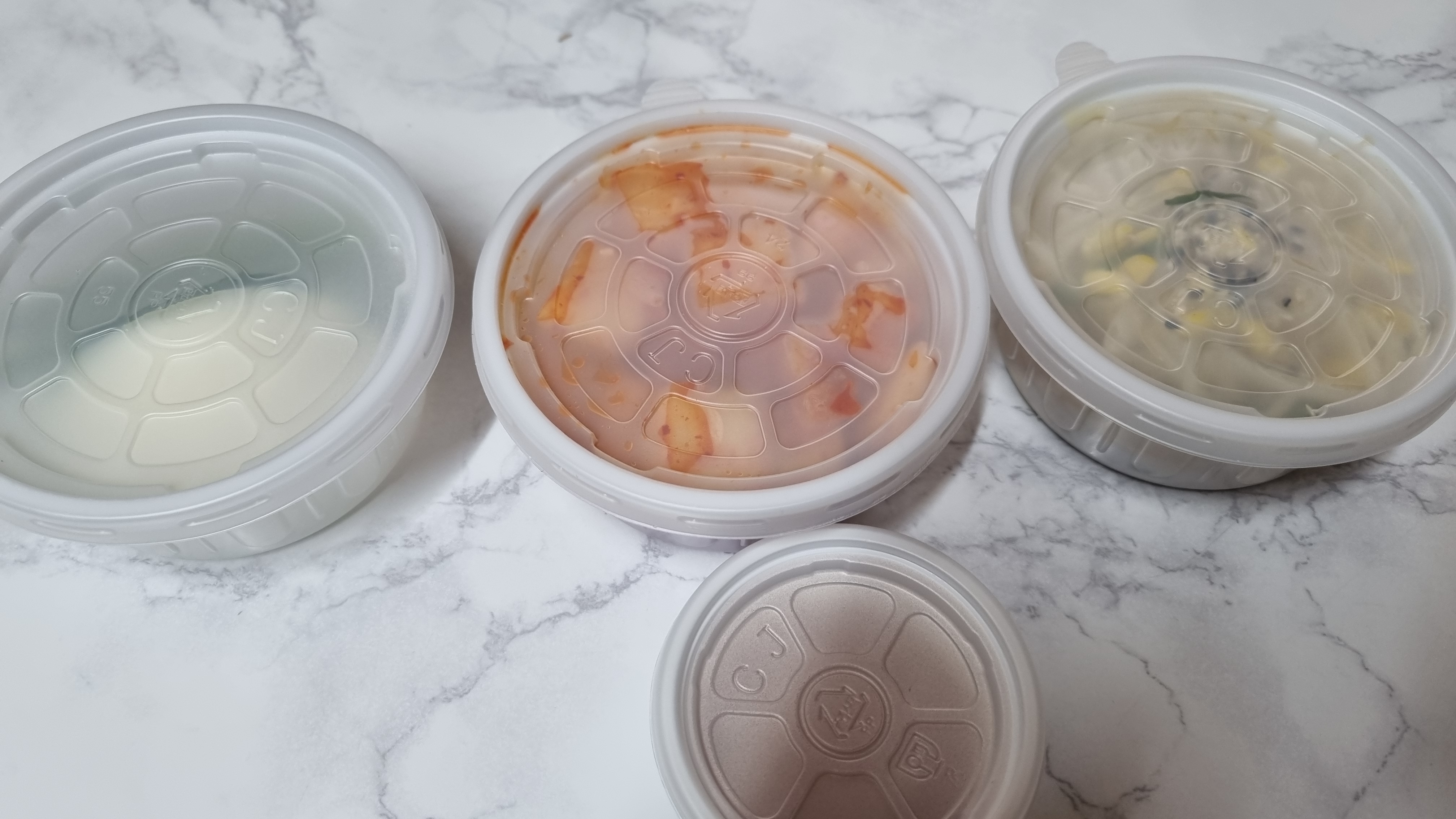 기본 반찬까지 크기별로 포장되는데 아주 조금씩 담겨 있습니다, 내용은 콩나물, 깍두기 김치, 양파, 고추, 된장입니다.